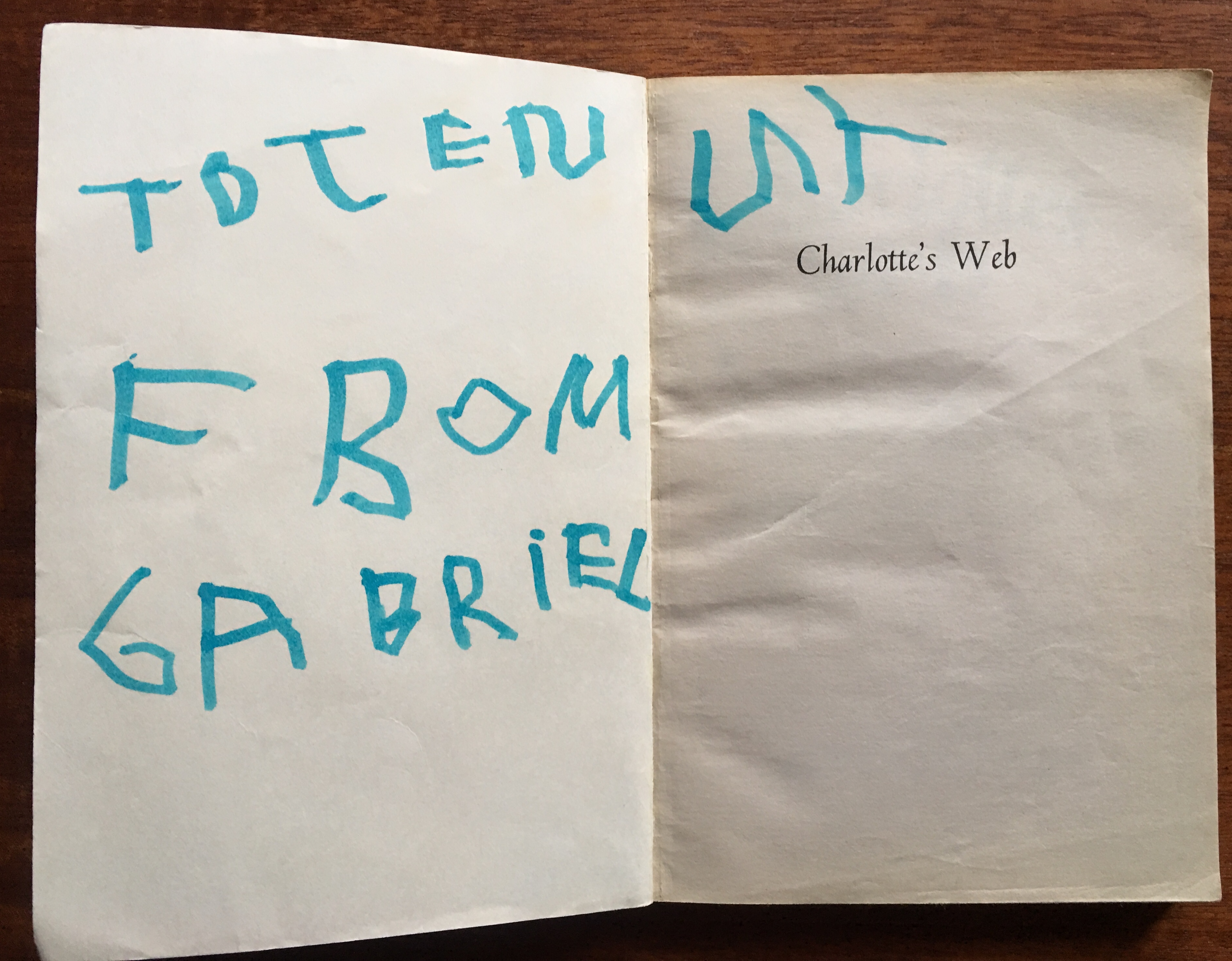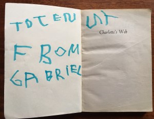 Thank you, Gabriel.  You are now in high school, doing very well.  Whenever you visit (once or twice a year), it means the world to me.  And today I found the book you gave me.  You loved Charlotte’s Web.  That book went straight to your heart, and I know your heart wanted to give me something when you left my class and moved on to kindergarten.  From my heart to yours, thank you!