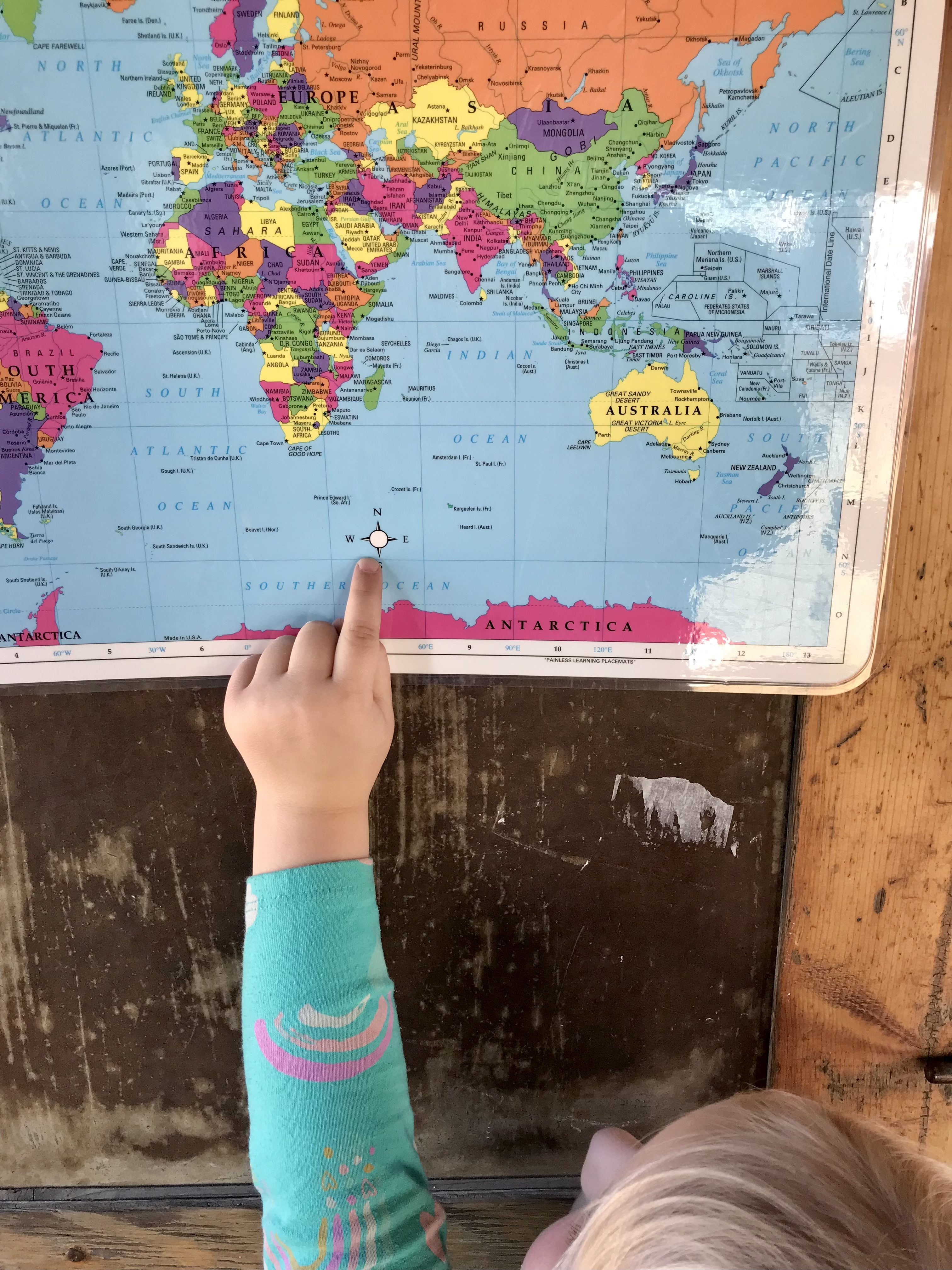 As we looked at the map of the world, figuring out where France is, Harry asked, “Jennie, what’s that?”  He pointed to the small compass rose.