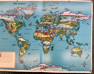Yes, it’s in the bottom right hand corner.  I told Harry and the children, “That’s a compass rose.  It shows you the directions printed on a map.  See the points?  Each has a letter; N, S, E, W.”  We talked about North, South, East, and West.  We talked about the points on the compass.  Then we looked at the world map and really discussed directions.  What direction is France in relation to Massachusetts?