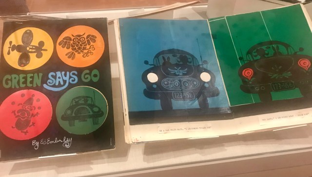 With my two treasured books in hand, and my mind full of what I had learned at the lecture, I toured the current exhibits. Ed Emberley was featured! My children loved his books growing up. Many of his illustrations were done from woodcuts. It was fascinating to see the original woodcut and the print itself. The one of Paul Bunyan was life size! Do you recognize these illustrations from “Green Says Go?”