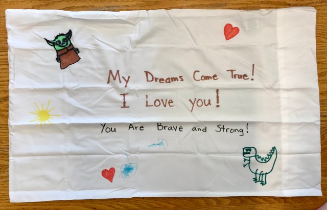 It was both fun and heartfelt. There is a consultant who works with the most troubled children and families, and the pillowcase idea started with her. It has changed lives. When the parent sent us a picture of the calendar, it meant so much. Thanks, Darlene!