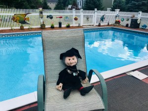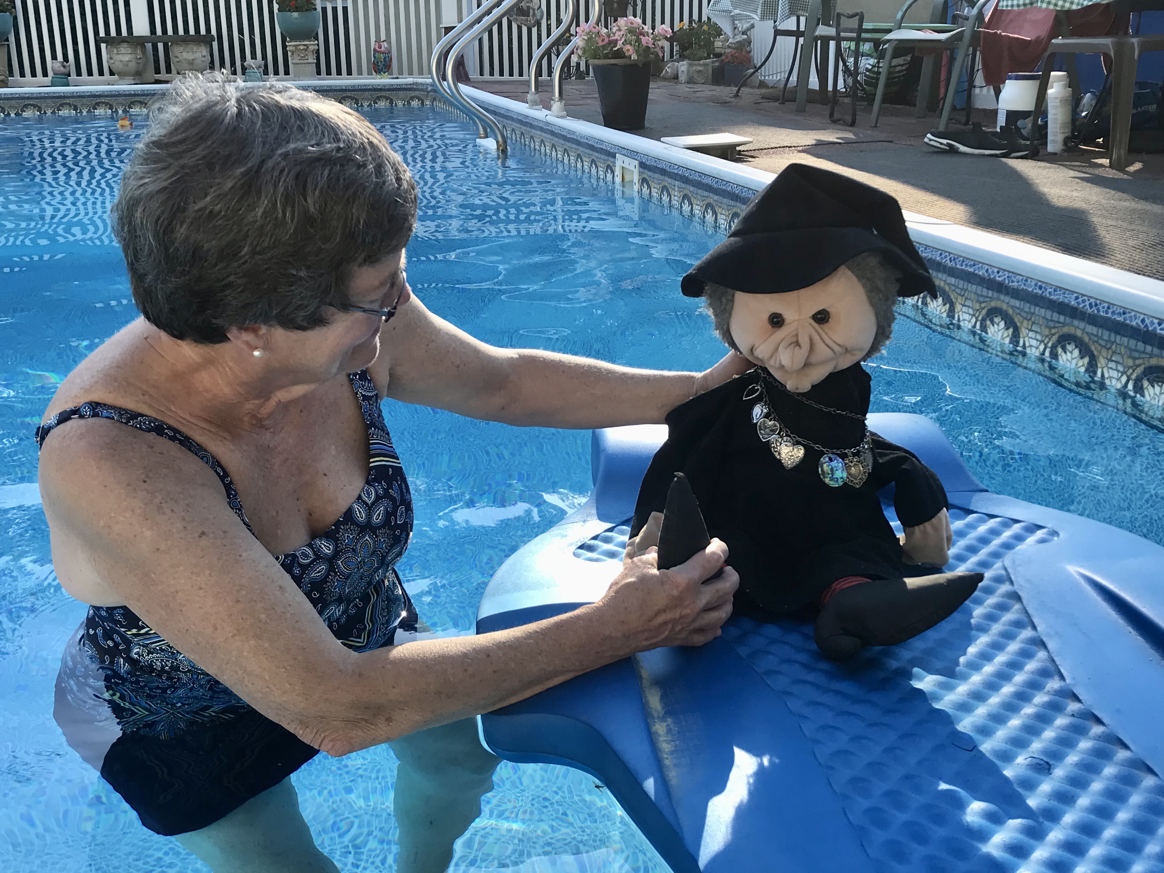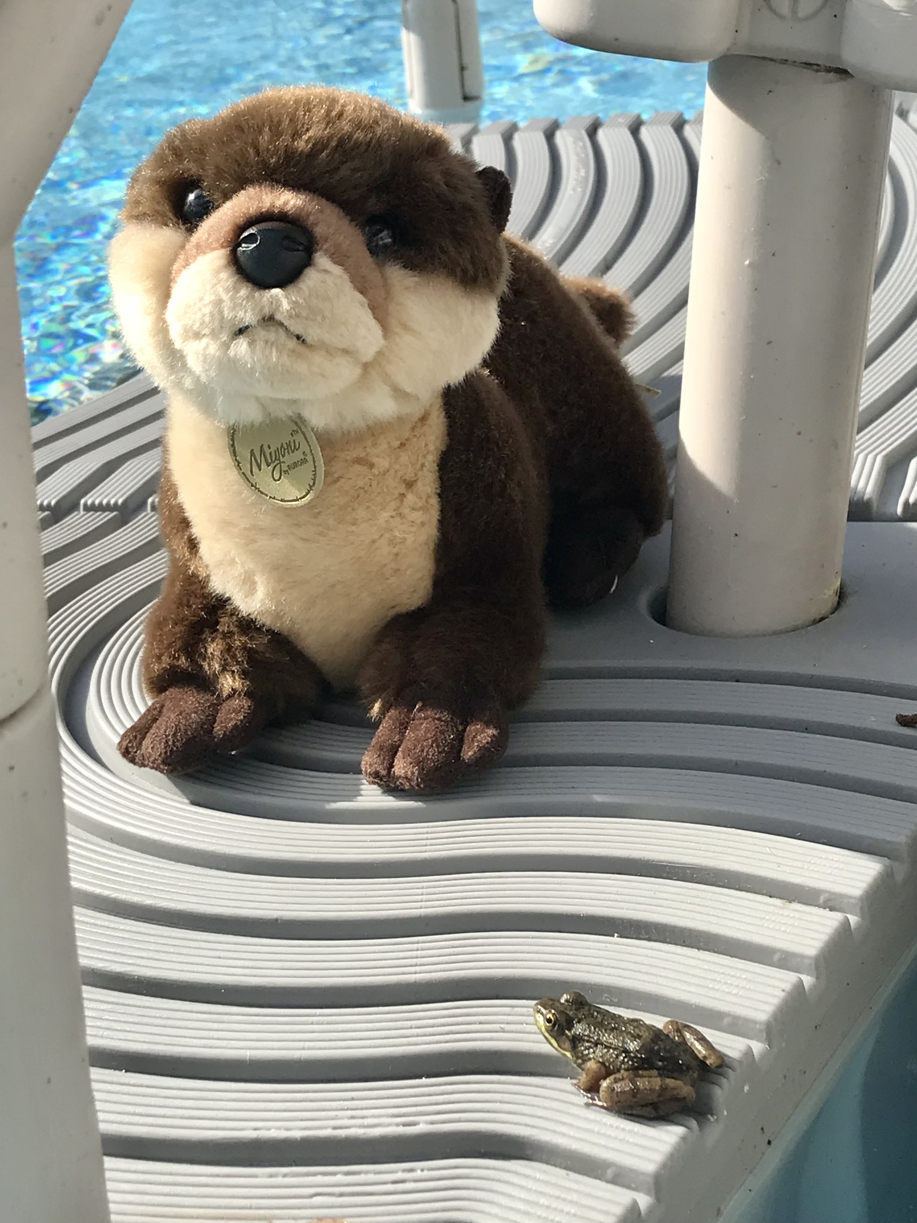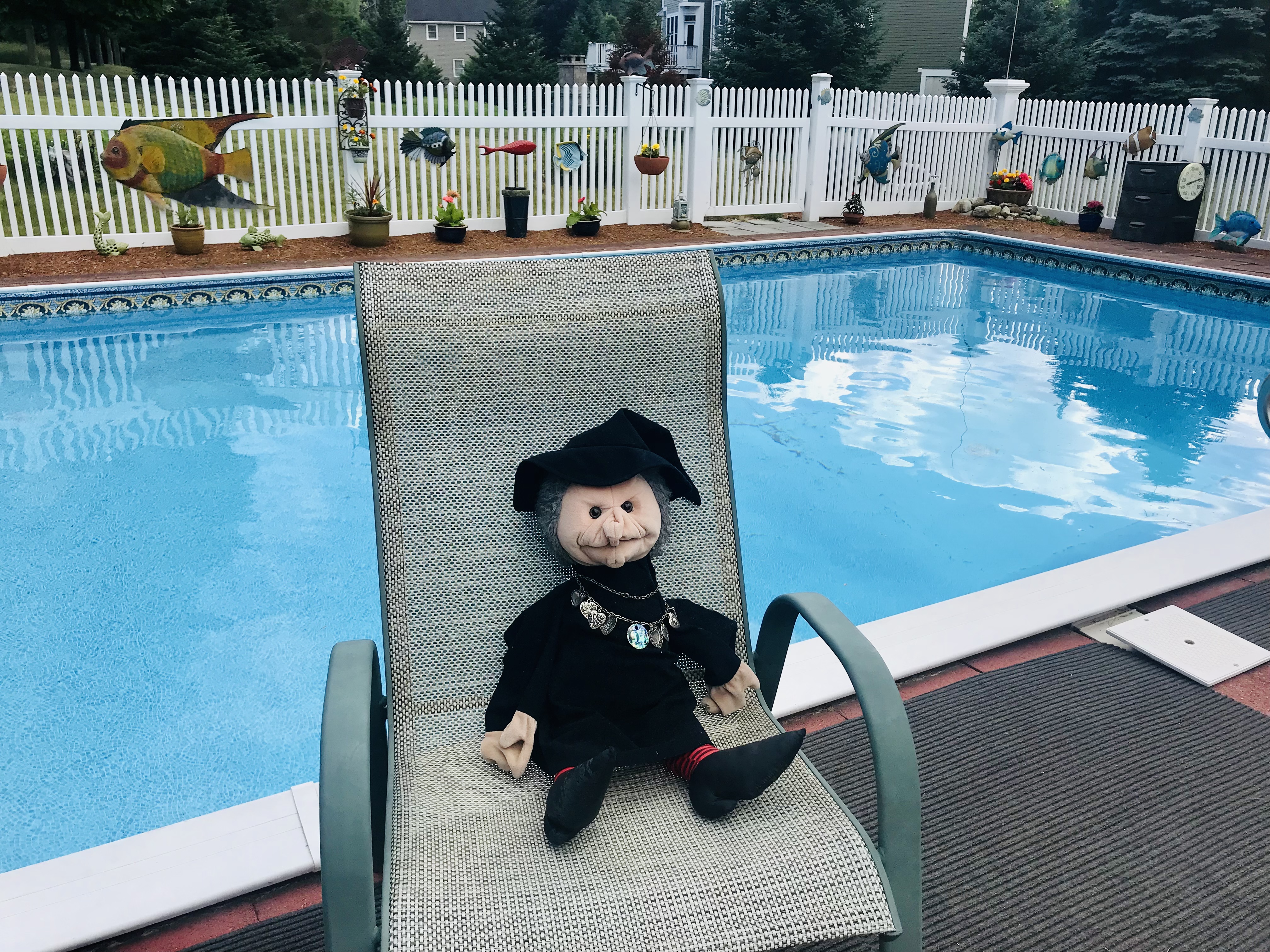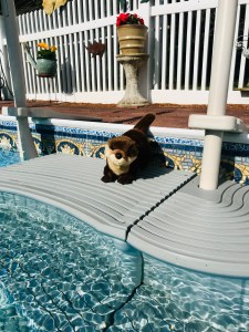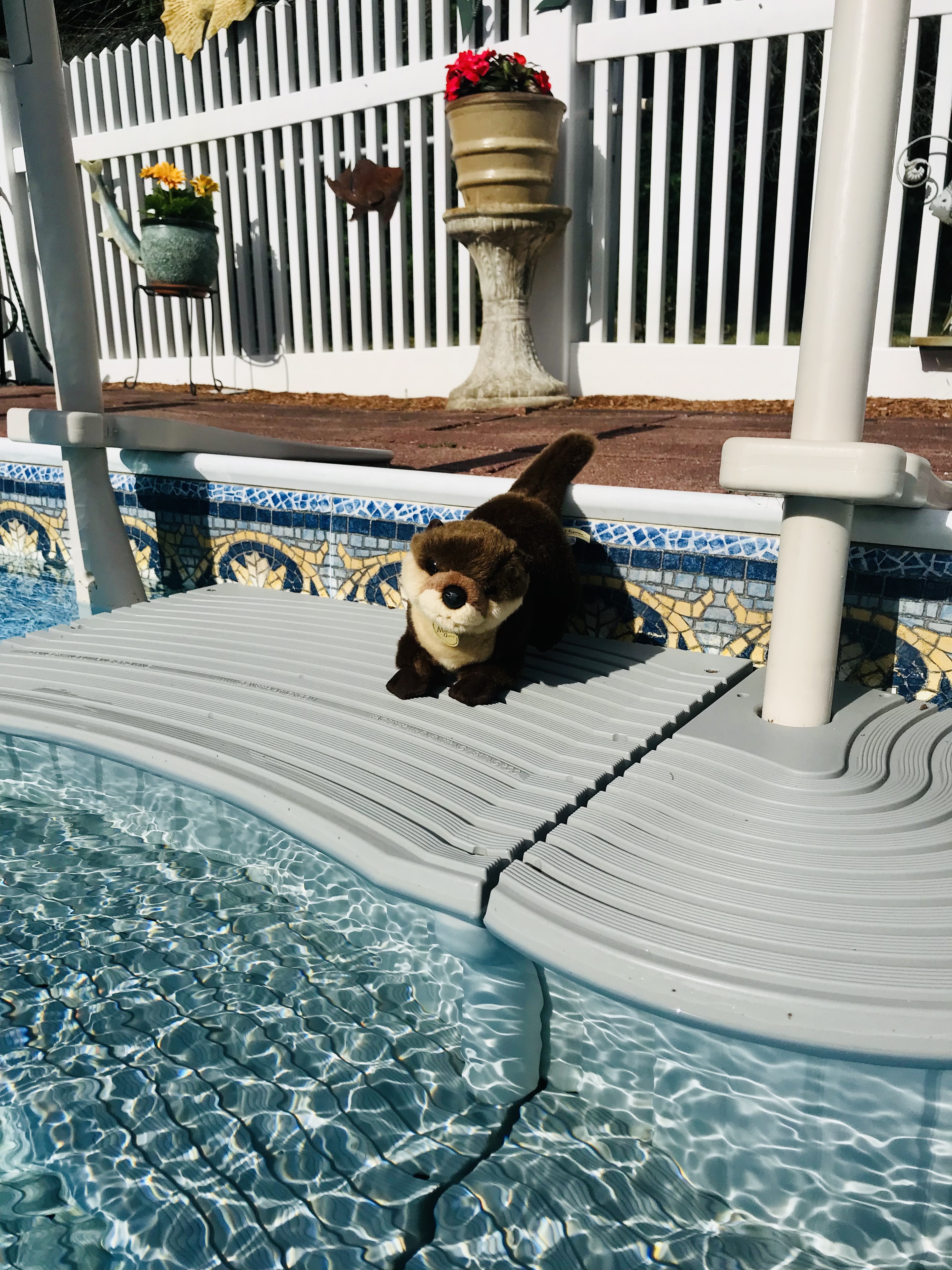 “Oscar, what has you so excited?  Oh, you see the pool.  Yes, I understand now.  You want to go swimming.  Okay, let’s go!  Gloria, do you want to come, too?  No?  What’s the matter?  Oh, you don’t know how to swim.  Well, Oscar certainly does.  Don’t worry, Gloria.”