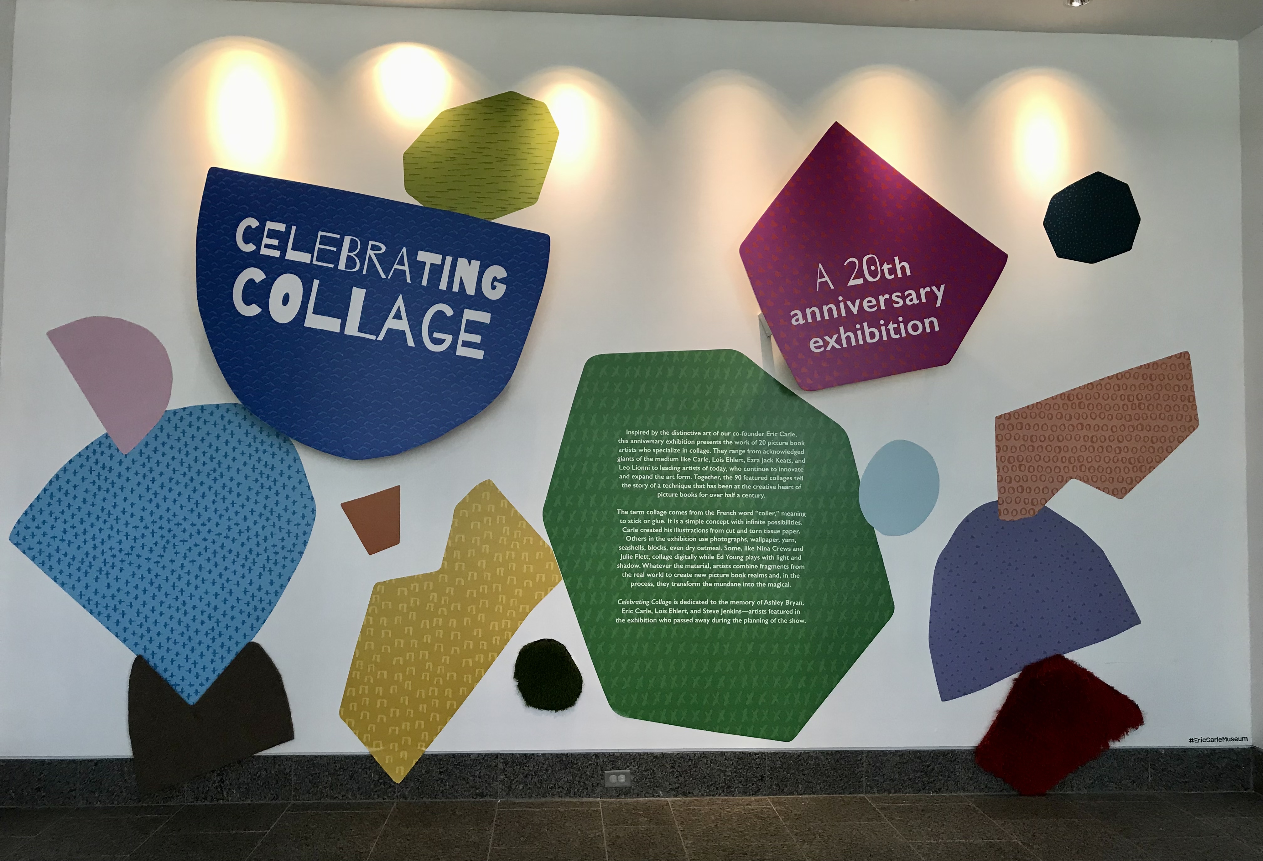 The museum is celebrating 20 years.  The main exhibit is Celebrating Collage.  Of course!  Eric Carle’s art was all done in collage.  What a perfect way to highlight his work and the museum’s anniversary.  The work of 20 picture book artists and 90 featured collages are on display.  In the words of the museum, they transform the mundane into the magical.
