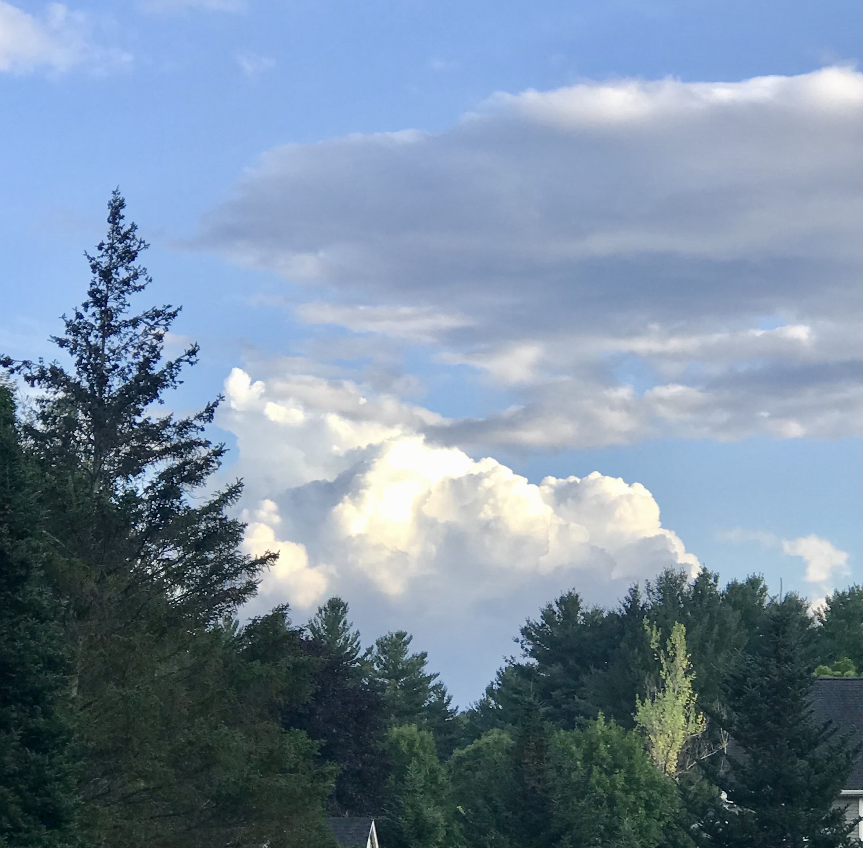 “Nope. The dark cloud grew. Ate the big white cloud. Now the sunset is peeking through. No rain.”