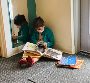 The books on our bookshelf are front-facing, and children have access to them any time. This photo was last week at school. It is a common scene in the classroom: