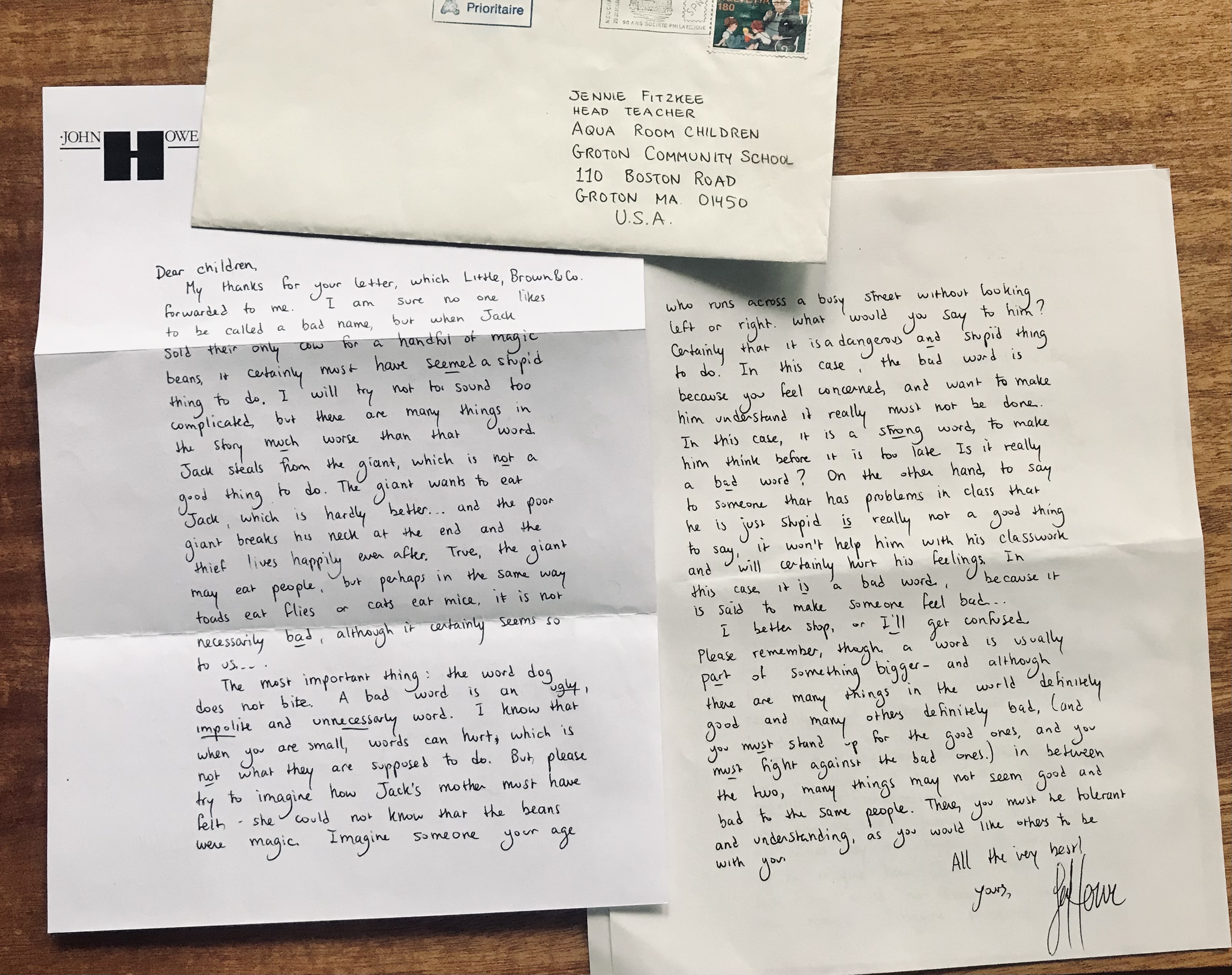 My thanks for your letter which Little, Brown & Co forwarded to me. I am sure no one likes to be called a bad name, but when Jack sold their only cow for a handful of magic beans, it certainly must have seemed a stupid thing to do… There are many things in the story much worse than that word. Jack steals from the giant which is not a good thing to do….