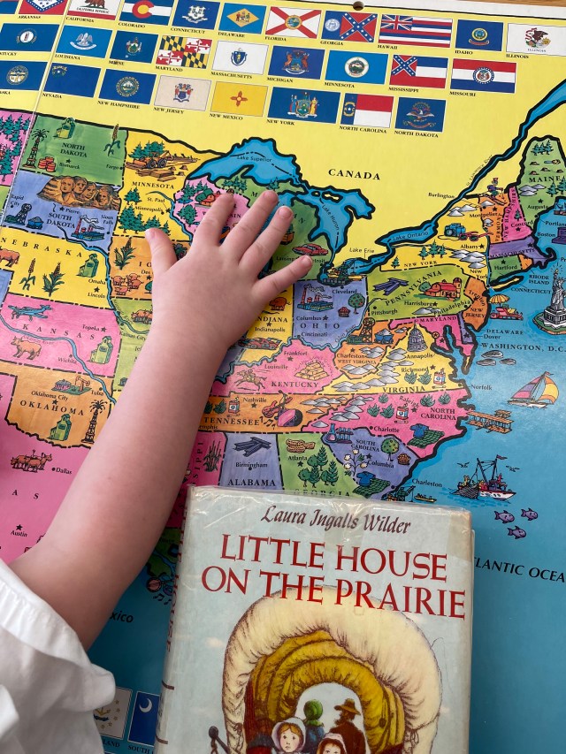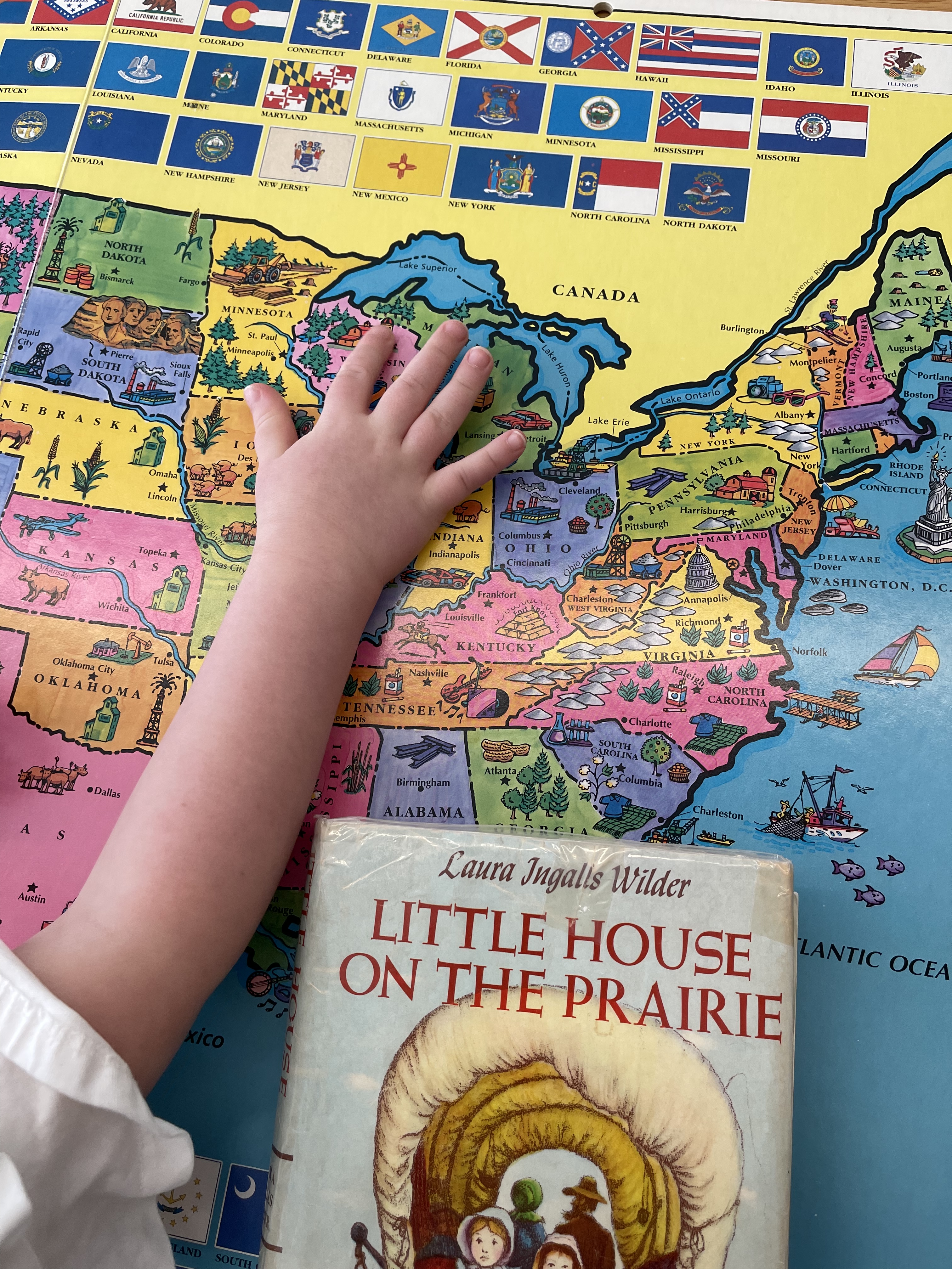 I pulled out our Big Book Atlas to show children Wisconsin.  There are trees, and a big lake, pictured on the map.  Children wanted to run their fingers across the trees and the lake.  They wanted to connect with – and say goodbye to – the little house in the big woods.