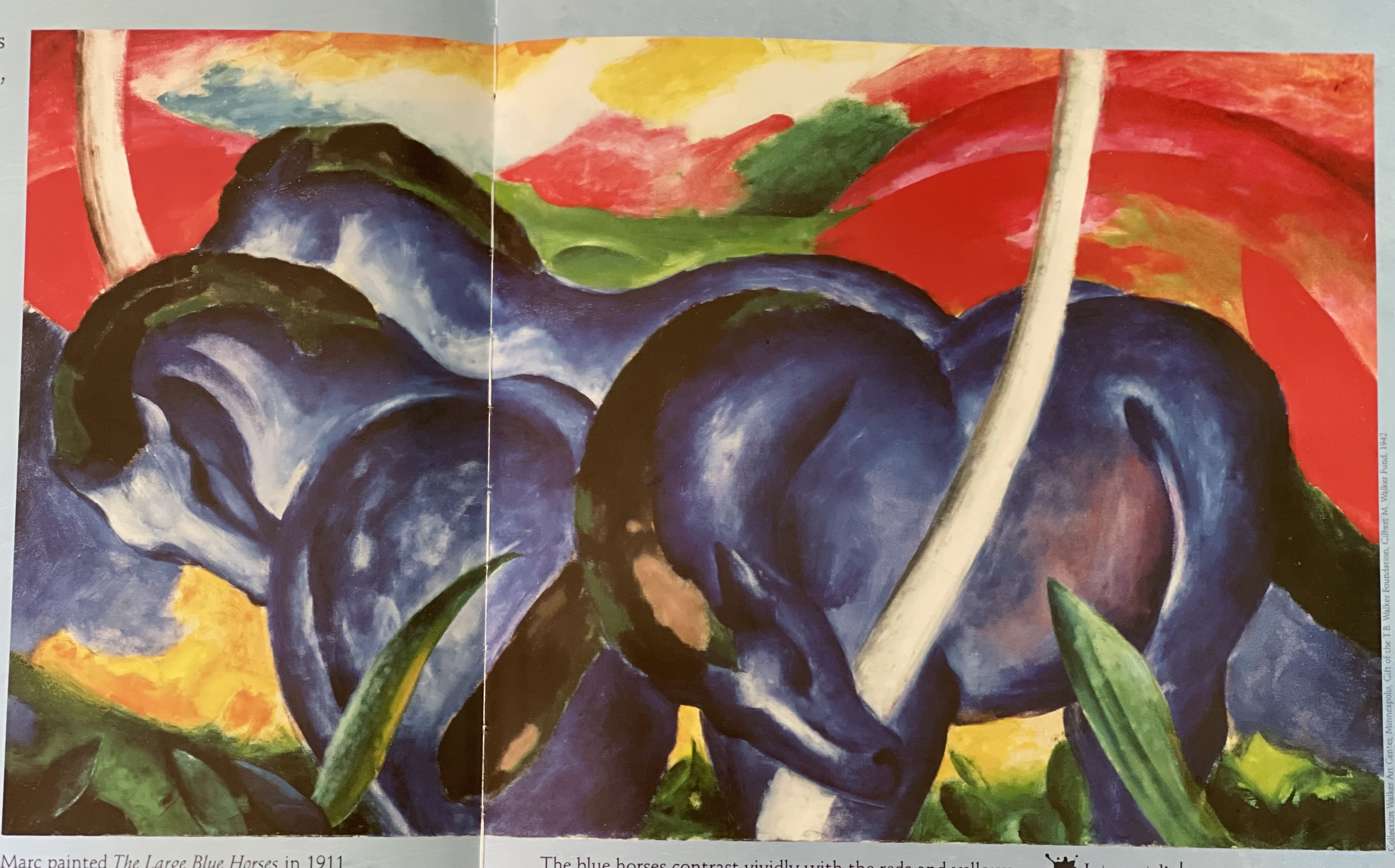 We introduced real artist paints in tubes and squeezed them onto pallets.  Children were painting like artists!  After studying major works of art, this was the perfect medium.  A child was taken by one particular work of art, Large Blue Horses by Franz Marc.