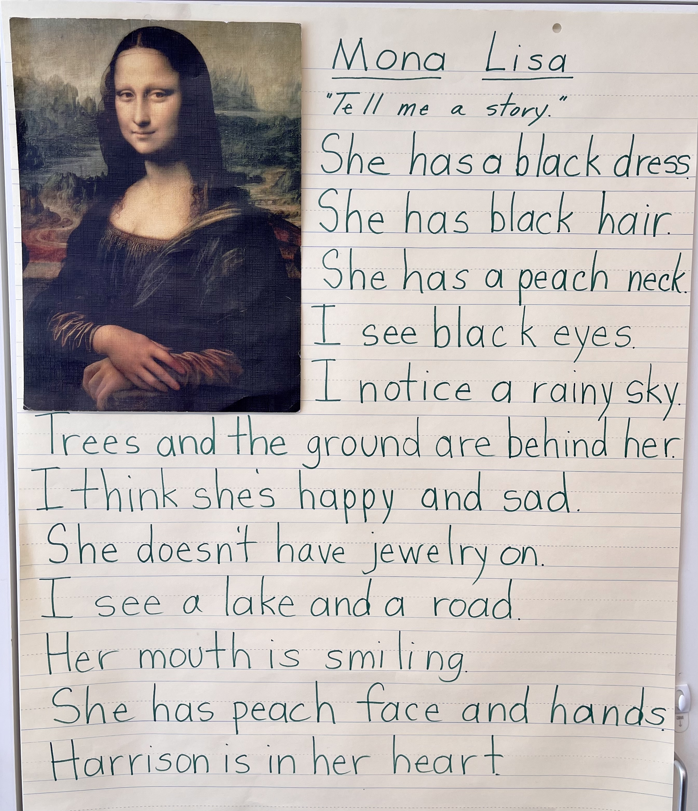 You would think after all these years I would not be amazed each year, yet I always am. Blown away is a good description. No one notices the winding red road and the blue lake in Mona Lisa’s background- but children see it. It’s really incredible what children can do when they’re inspired. Harrison was the last child to comment, and after all he heard from other children, it was his way of saying he loves the Mona Lisa. Thank you, Darlene!