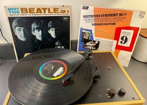 How did we keep this art work flowing, day after day?  Music!  Music inspires art.  I brought in my record player and albums.  I introduced the record player slowly, as if I was figuring out what it does and how it works.  Rubbing my finger under the needle and hearing the sound was like finding the end of the rainbow.  Then, I pulled out a record album, Beethoven’s Symphony No.9.  Putting the record onto the player and turning it on was electric for children.  You could have heard a pin drop.  The music begins softly and quickly becomes loud and bold.  What a thrill for children.