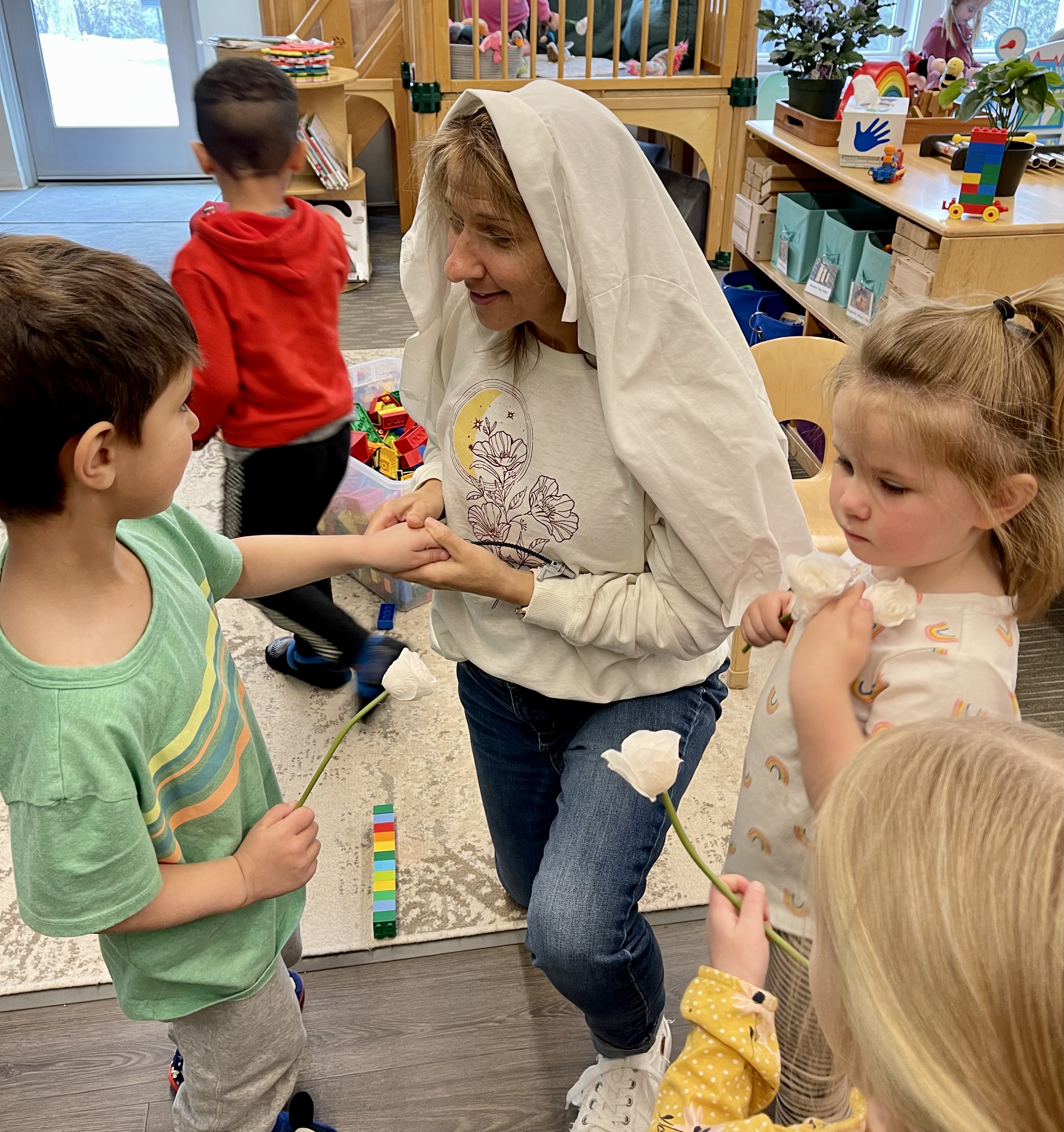 Children loved playing with these white roses.  Who knew?  Two children held the roses and wanted to have a wedding ceremony.  They asked my fellow teacher to marry her.  She knew this meant a ceremony, so she grabbed the doctor’s coat from the hospital to be her wedding veil.