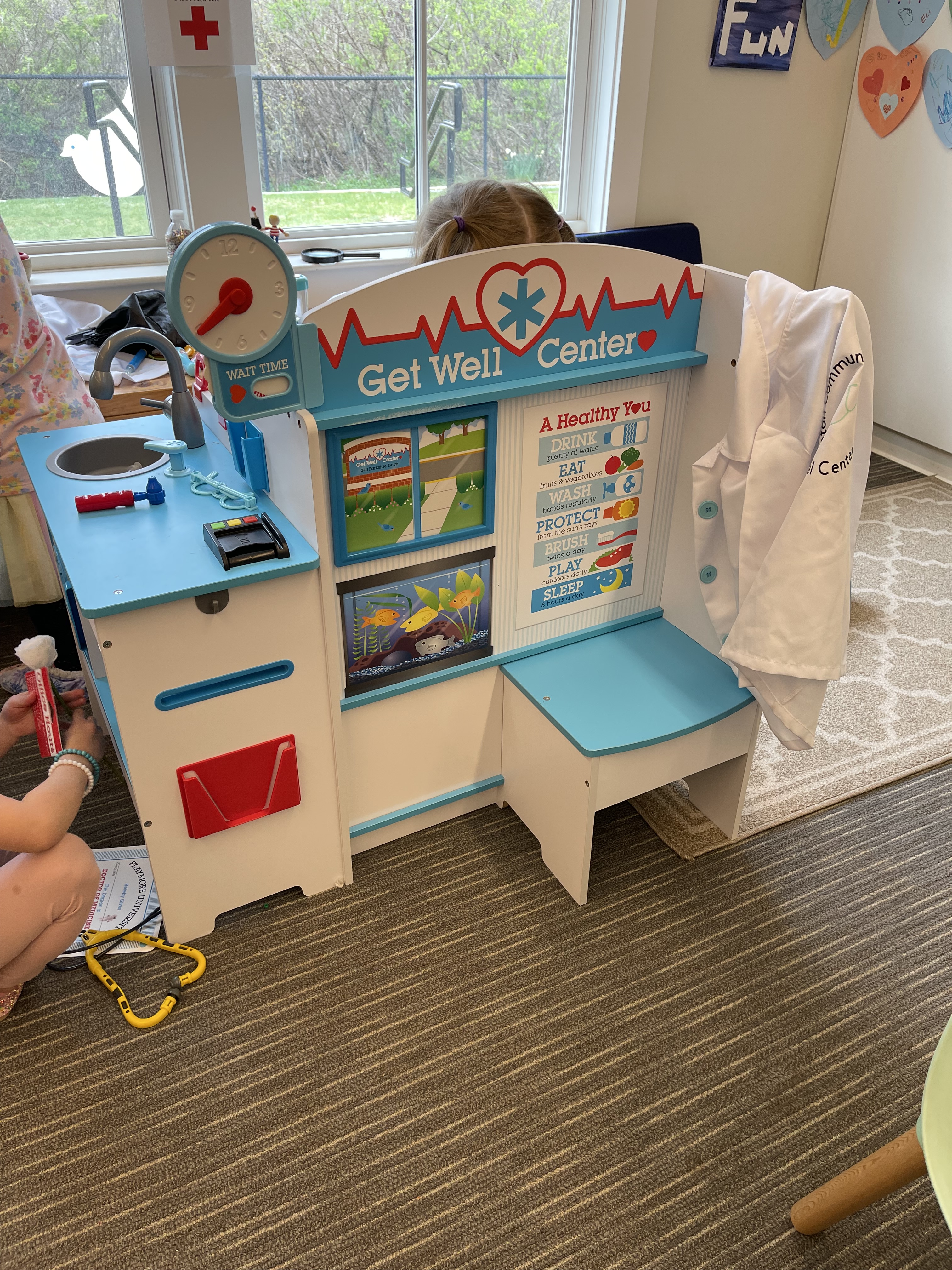 We have a hospital in the classroom’s dramatic play center.  It is very popular.  Most importantly, it sets the stage for play, unencumbered by adults.  Today doctors were hard at work.  There were many patients.
