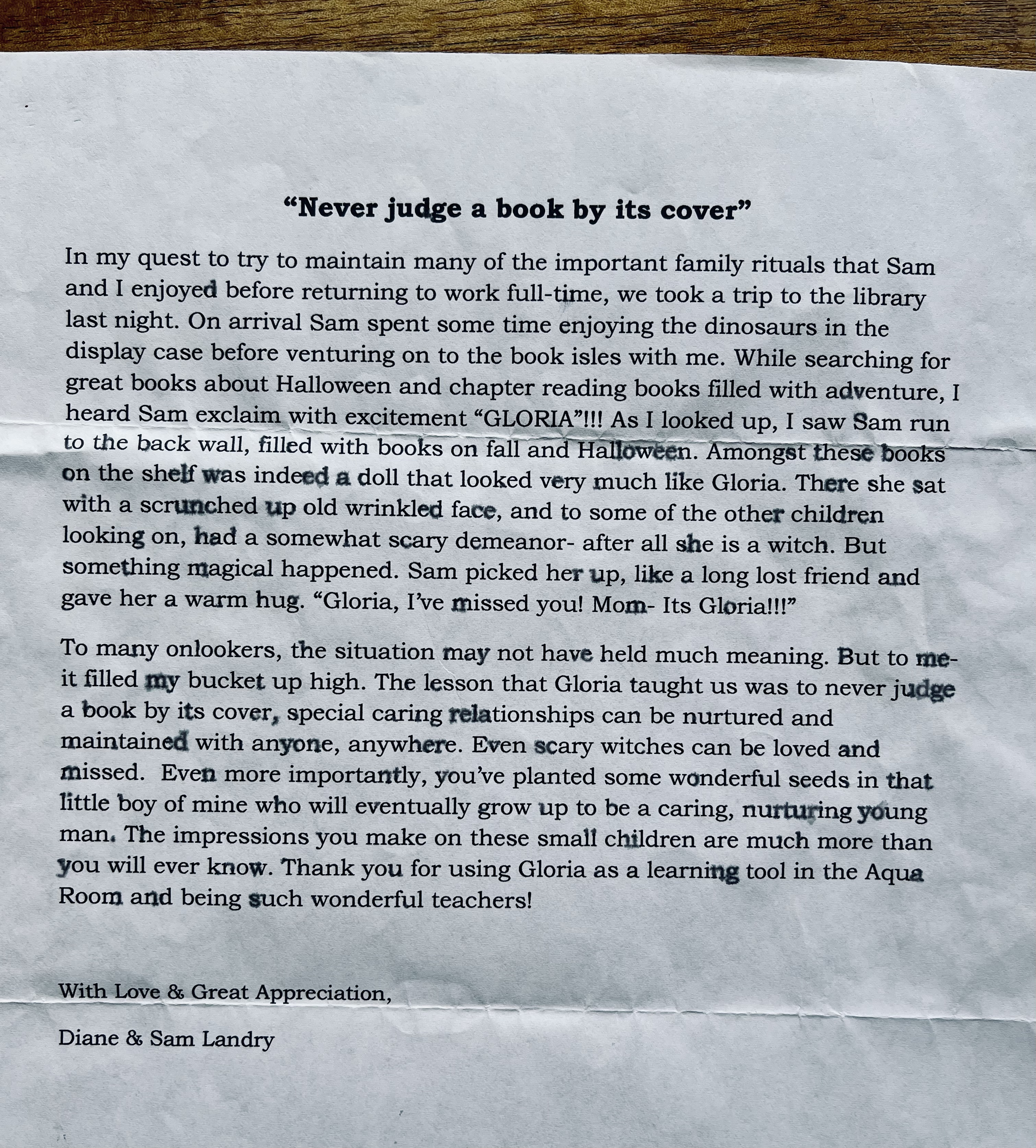 When diversity became part of teaching, teachers in our school were given ‘persona dolls’, Asian, Black, Hispanic, etc. I was the only teacher who refused, because those dolls meant nothing to children who had never seen a person of different ethnicity. Enter Gloria who is old and not pretty. I think I chose wisely.🙂