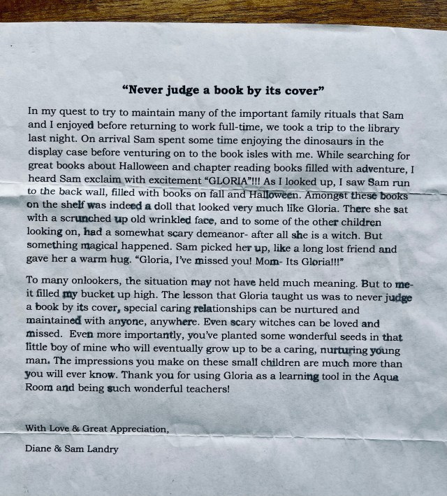 Sam’s preschool years were delightful.  He adored Gloria, and his mother told me about the day he saw her in the library and was over the moon.  There’s more to come on that story.