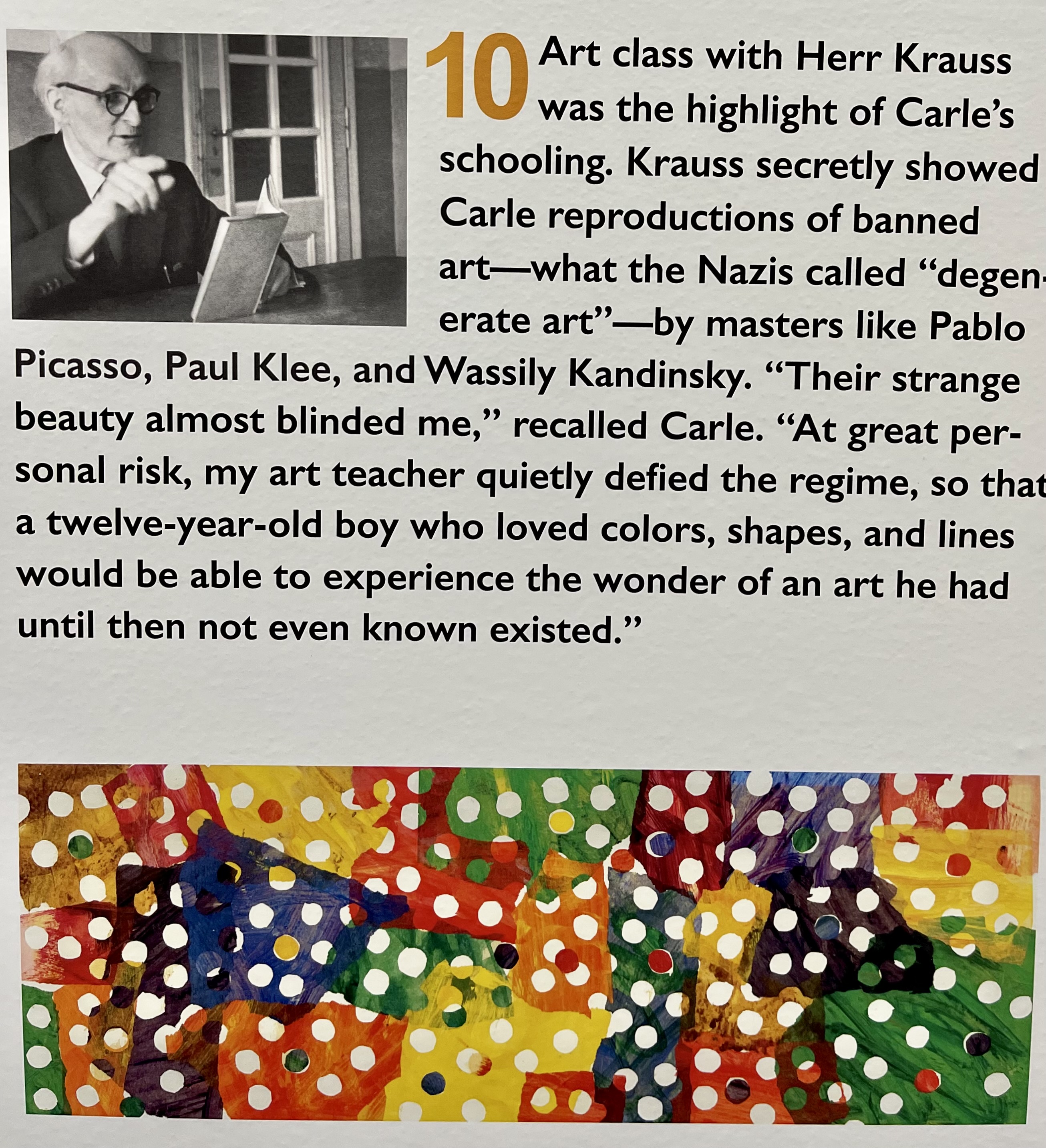 The side hallway at the museum has a permanent display about his life.  I’m so glad, as everyone should know how he and his family moved back home to Germany in the 30’s just when the Nazis took over, and how his art teacher risked his life to show Carle ‘forbidden art’ by ‘degenerate artists’ – Picasso, Kandinsky, Klee, Matisse, Marc and others.