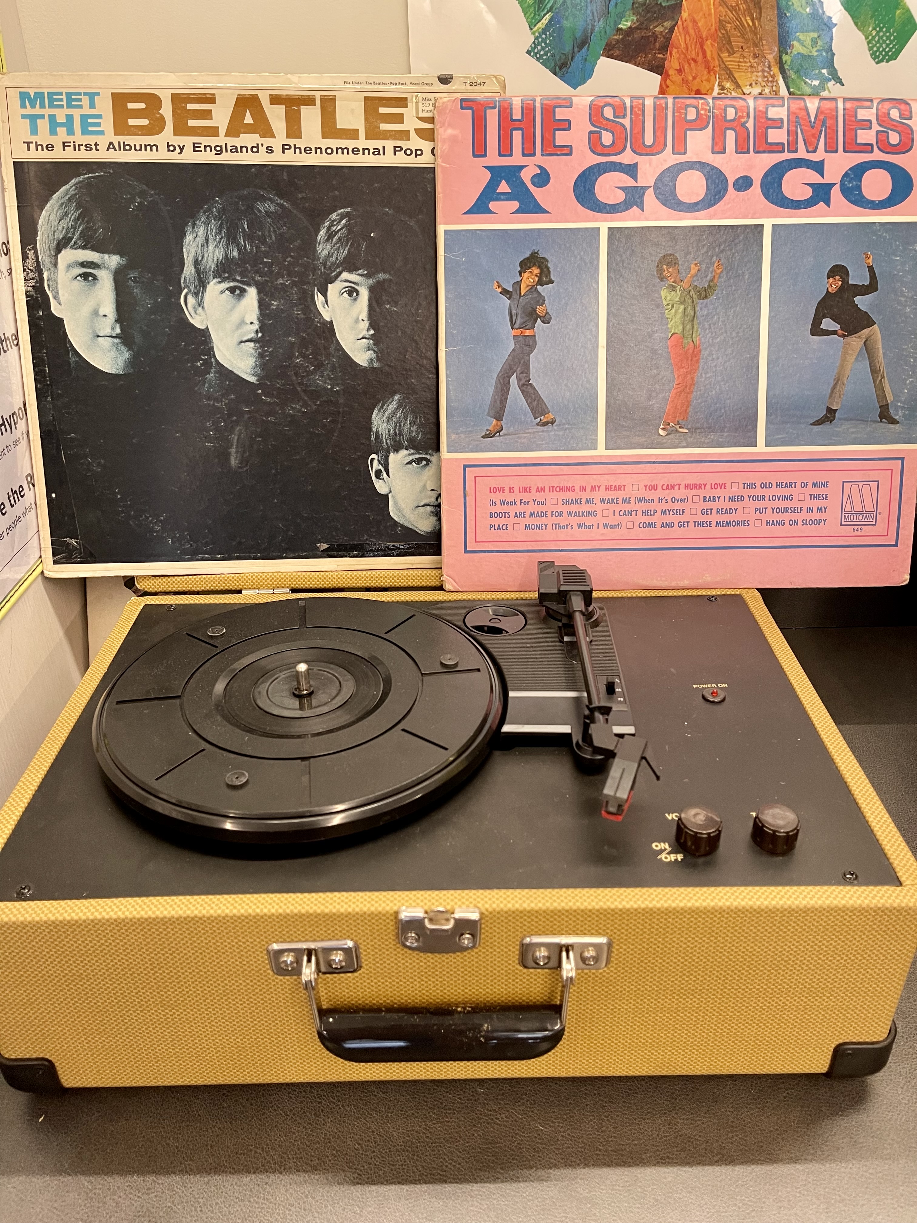 I bring in my old record player and put it on the floor.  “What is it?”  The guesses are a suitcase or a box, or (when opened), a gate.  Readers, I wish you could be a fly on the wall when I turn it on.  A red light!  The turntable spins, and when I rub my finger under the arm, the sound is loud.