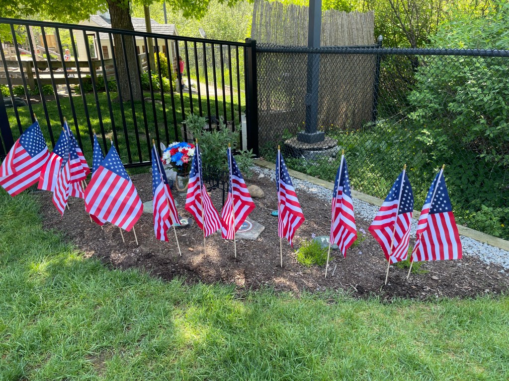 I love Steve’s flags. While I proudly fly a big one, I need/want to plant the little flags – like the photo of the flags in our Memory Garden at school. I would love to see the decorated house in your neighborhood!