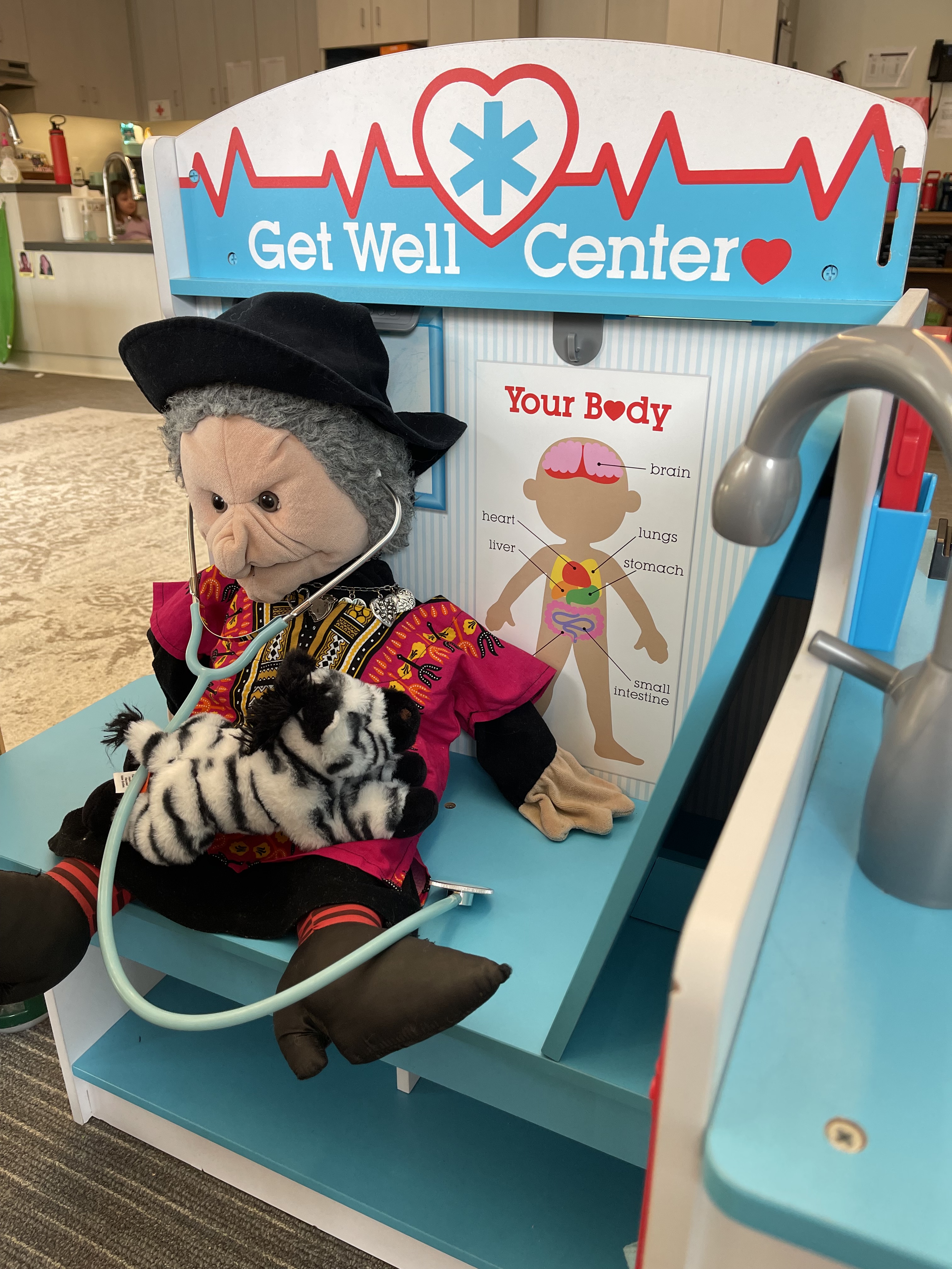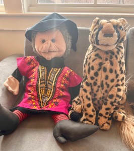 We’re learning about Africa. Gloria dressed up in her African shirt and played with our cheetah.
