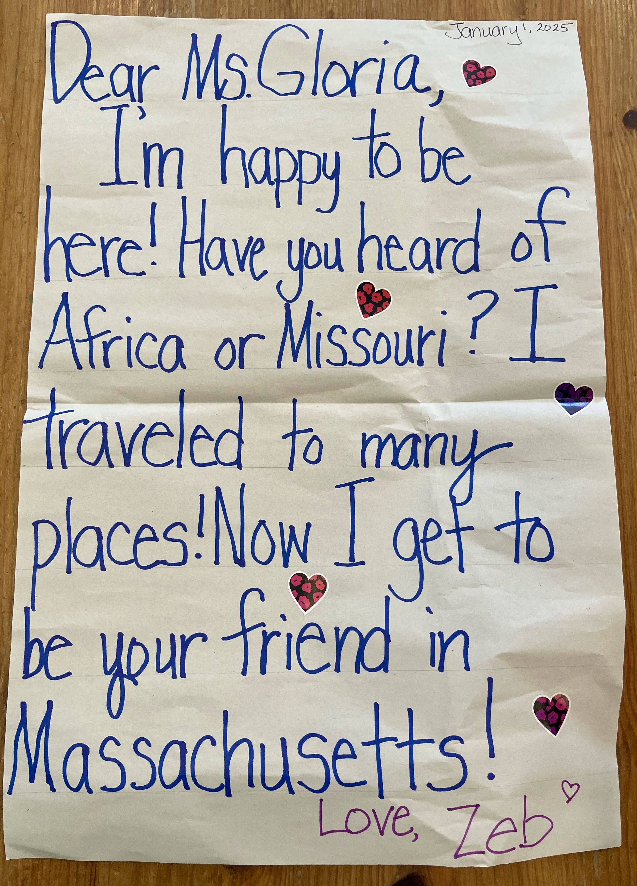 It was Morning Meeting when I opened the package containing Zeb. As soon as I pulled him out, the classroom went silent. Children knew it was a package for Gloria. Their curiosity and excitement was on steroids.