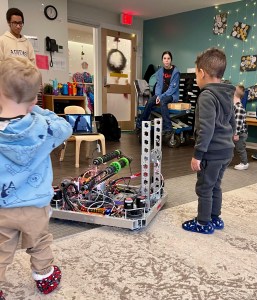 Children love robots. They’re a great introduction to STEM (Science, Technology, Engineering, Math) learning, and robots are very cool. I invited our local Groton-Dunstable High School Robotics Club – The Robotomies – to visit the Aqua Roomers with their robots. My goodness, they were wonderful!