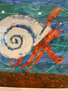 While the exhibit had many of Eric Carle’s illustrations, I was struck by his art with acrylic painted aluminum foil. It was beautiful! I was nearly nose-to-nose, staring.