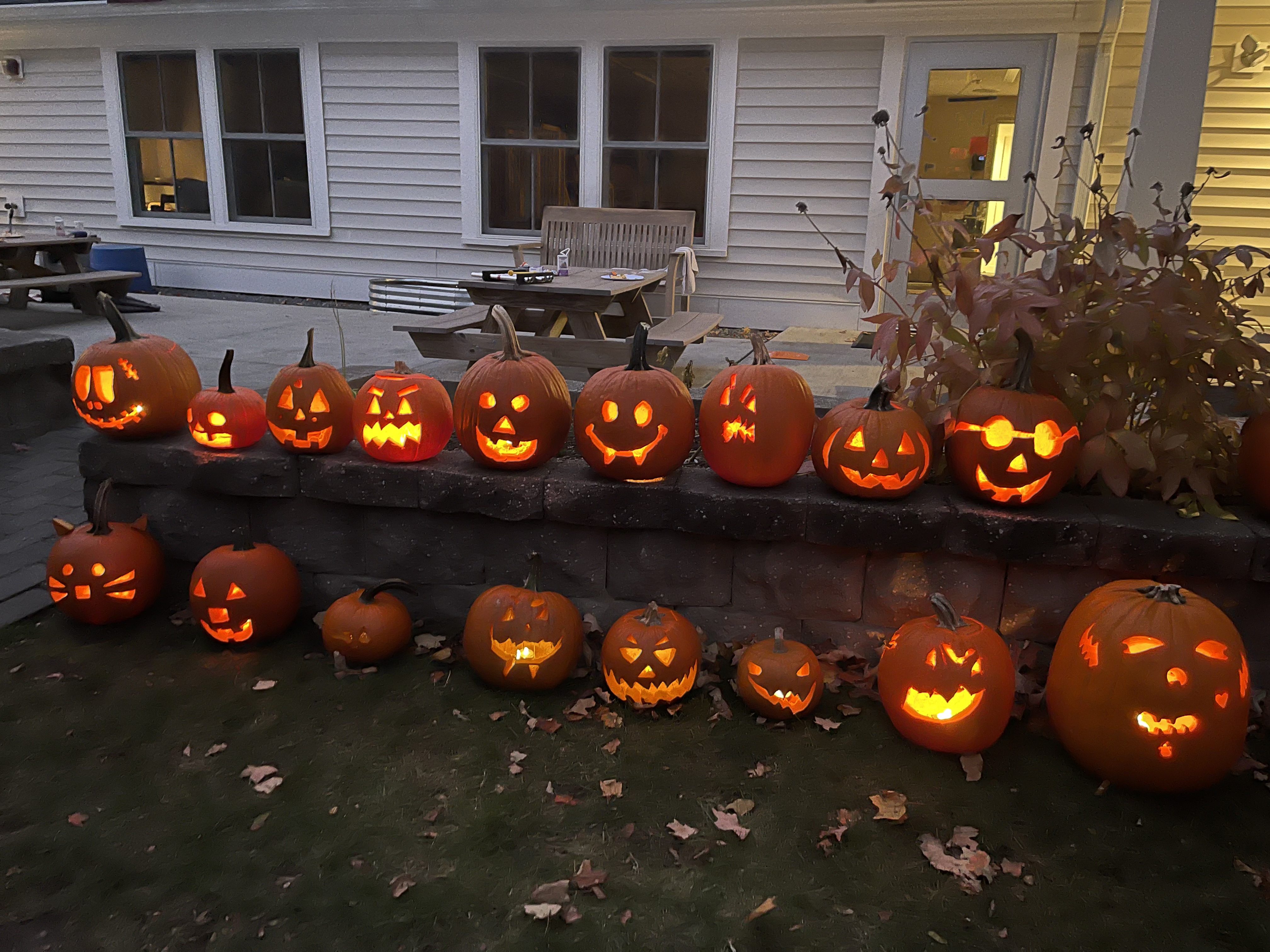 Tonight was a magical evening.  Pizza dinner at school is pretty cool; yet carving a pumpkin into a jack-o-lantern with your family is a memory builder.  We so enjoyed all the activity and excitement with each family.  As the sun was setting, arranging all the jack-o-lanterns on the stone wall was filled with anticipation.  Each one was lit with a tea light, glowing in the darkening sky.