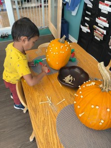 Before we carved our jack-o-lantern, we hammered golf tees into the pumpkin.  Wouldn’t you love to do this?  When an activity is good for children – in this case developing hand muscles and eye-hand coordination – and it’s fun, it’s a Win-Win.