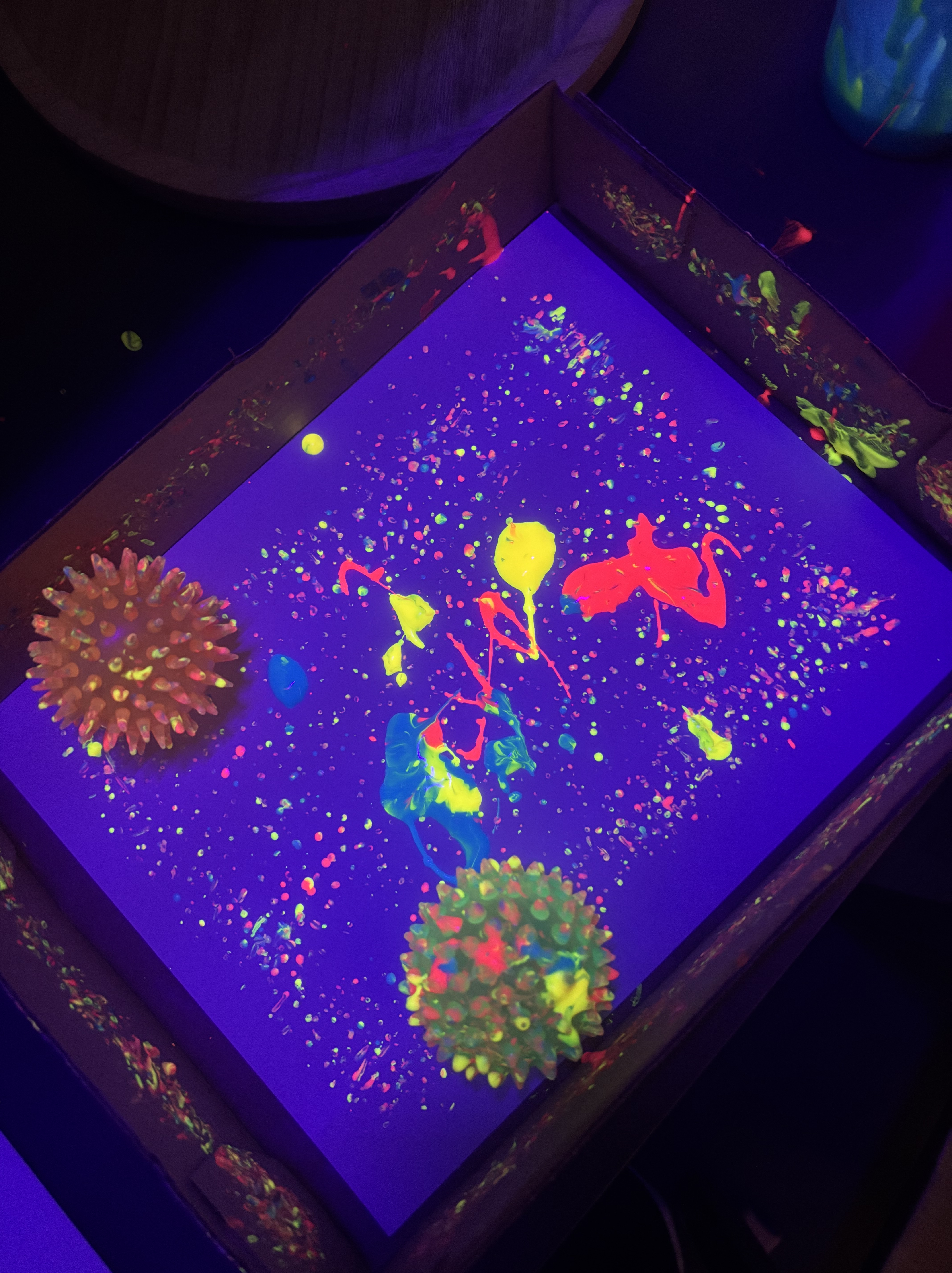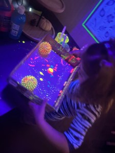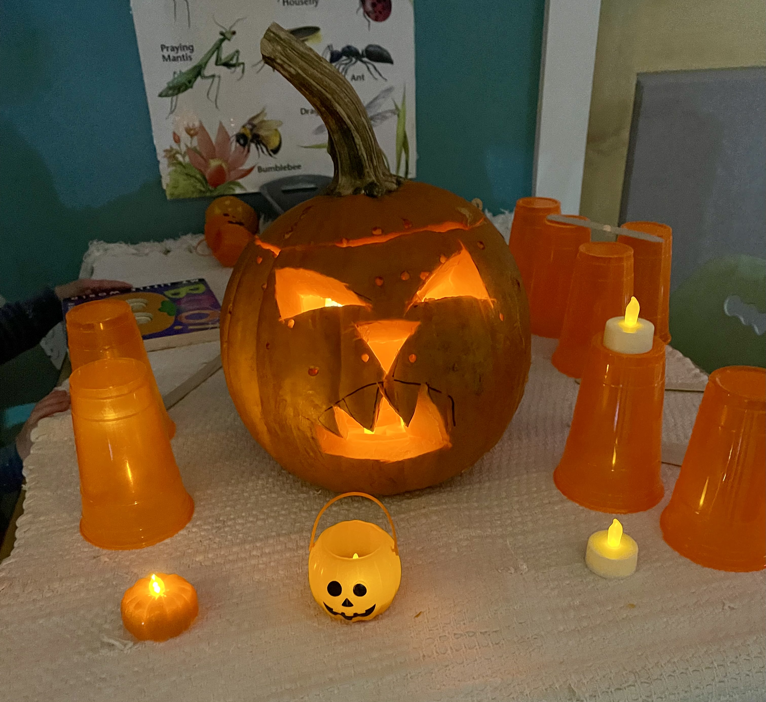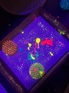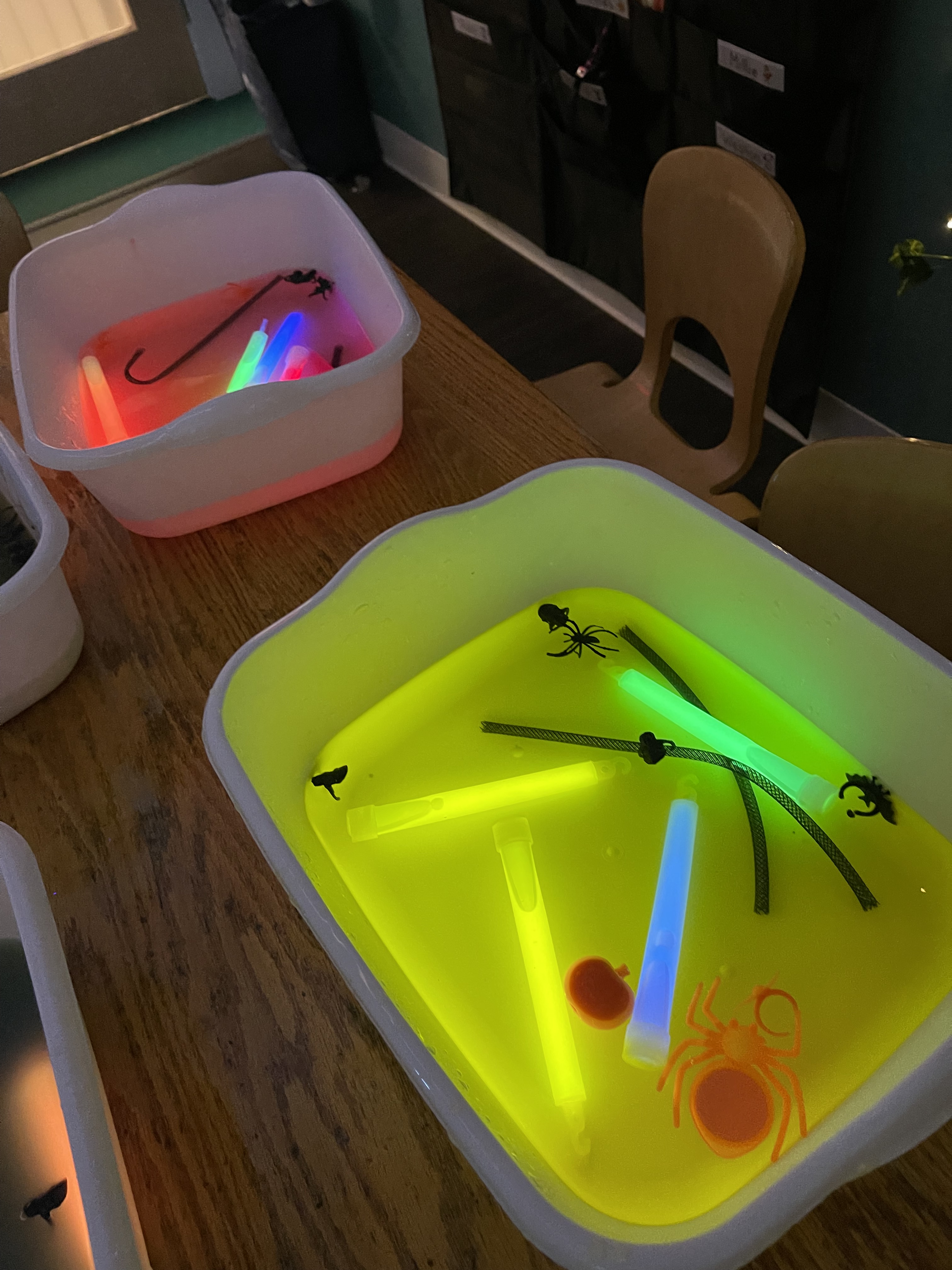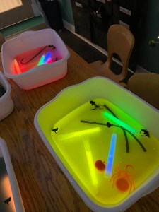 Halloween is exciting for children.  At school we had a ‘Day in the Dark’, using flashlights and glow sticks for light.  Playing with black playdoh on shiny foil, painting with neon paint and using a black light, and playing with glow sticks in colored water was so much fun.