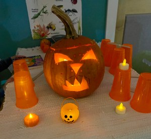 Of course Halloween does not go by without a Jennie Story, The Halloween Story.  By now in the school year, children know our analog clock and can (mostly) read the numbers.  Every day at lunch they ask me what number before my story.  Usually it’s the number 6, but sometimes it’s a 7.  Do you know how important the combination of the analog clock and waiting for a Jennie Story is for learning numbers?  And of course for patience?