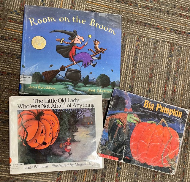 Do you see how ragged Big Pumpkin is?  I learned ages ago from the library that those are the best books, because they have been read over and over again.