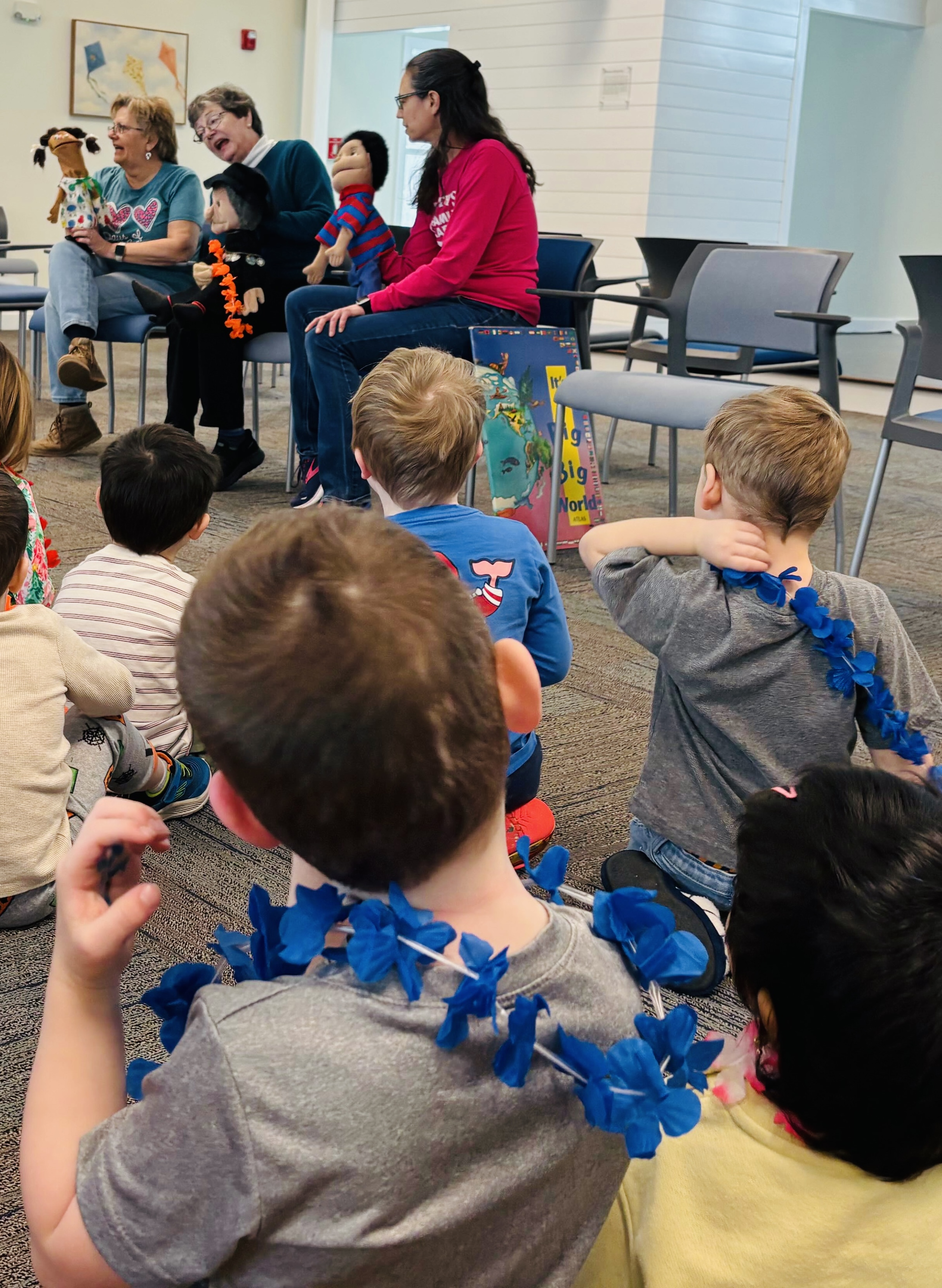 Gloria couldn’t speak to all the children, but as soon as she saw Rosie they had a grand time and she relaxed.  Then she looked at everyone and talked.  Oh, how she talked!  She showed them the big map on the screen, how she would fly from Boston to England.