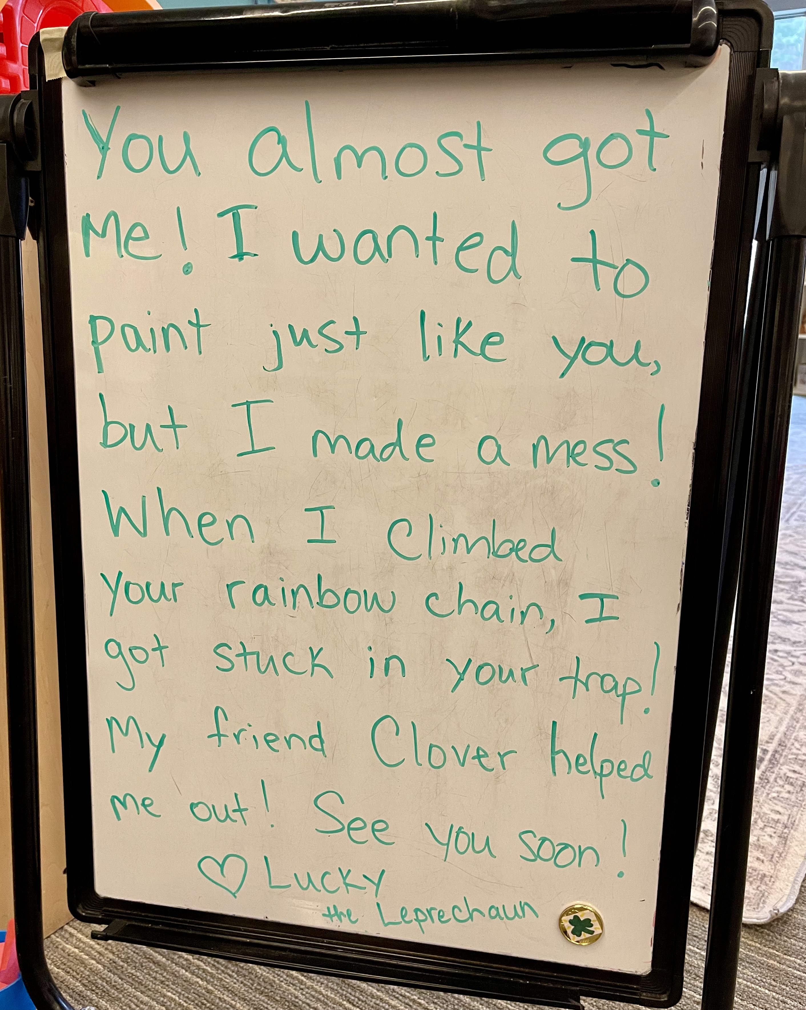 It didn’t work. Lucky the Leprechaun is very clever. When school opened this morning, here is what we saw: