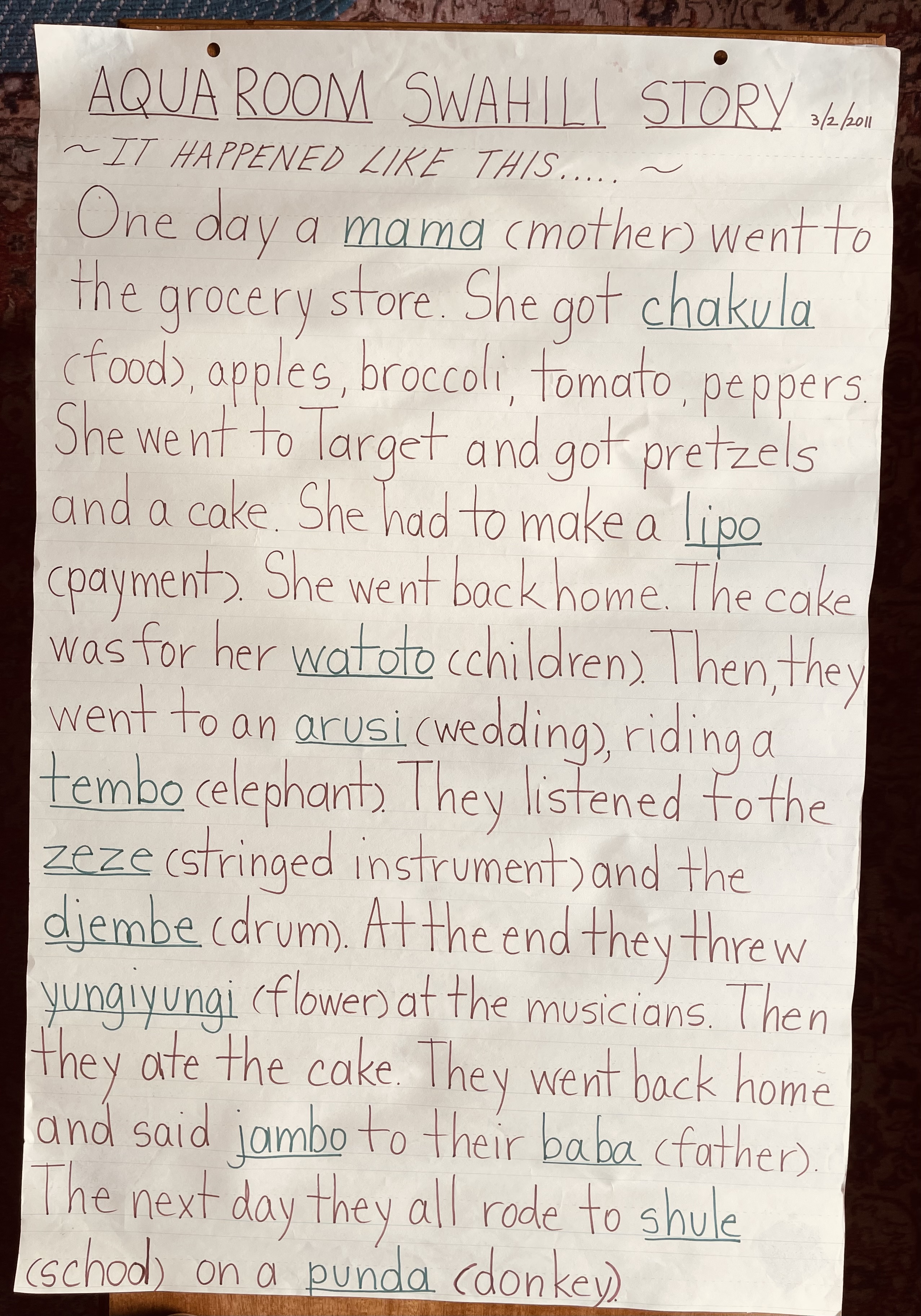 “Because this is an African tale, we learned some Swahili words, and children wanted to write their own story. So, we substituted Swahili words for English words.”
