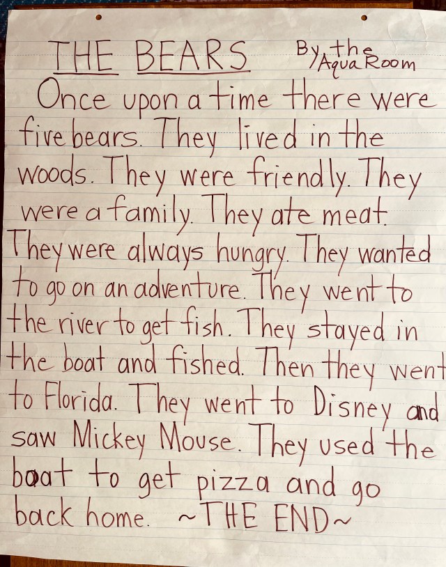 “Now, you have the power to tell the story about the child you interviewed. But the challenge is to incorporate a cultural element. You can do that! Children have creative minds, and given an opportunity, want to make up stories. This fall we learned about woodland animals, and children wanted to write their own story Bear Story.”
