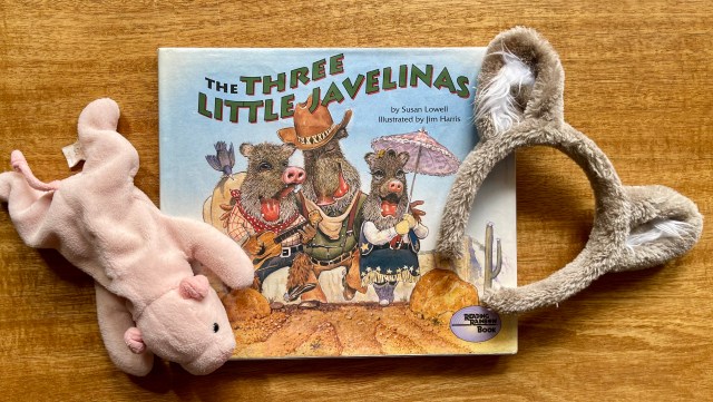 “Many children’s books have a multicultural theme. Classical stories often have a new twist. One of the best is The Three Little Javelinas, by Susan Lowell, a take-off of The Three Little Pigs. I’m going to read you the story and use props, a pig and wolf ears.”
