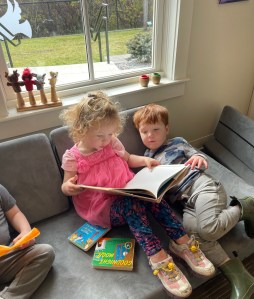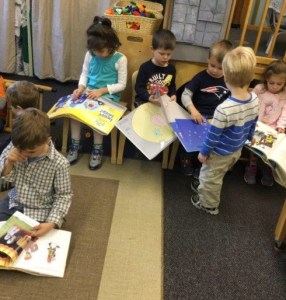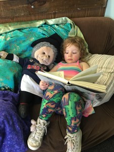 This school year has been a change, as the children are younger. It took a month to adjust my expectations to their abilities. Can they scissor cut? No. Can they draw people? Barely. I was spending nearly as much time in the bathroom changing diapers as I was teaching. Once we became a family (I love when that happens) it became clear these children may not be artists or builders, but they are passionate book readers. They are singers and caretakers of of our dolls – especially Gloria. She has spent every single weekend with a child. Lunchtime always has a Jennie Story or a Fairy Tale. The favorite is my version of “Goldilocks and the Three Bears” – “Goldilocks and the Three Dinosaurs.”