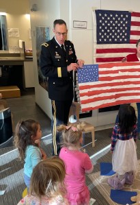 Today children thanked a veteran. That in itself is a big deal, because the children are preschoolers. In order to thank a veteran, I need to give children a context of understanding. That starts with songs, and my preschoolers love to belt out “God Bless America.” We often sing along with the book.