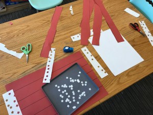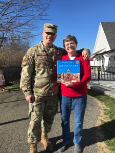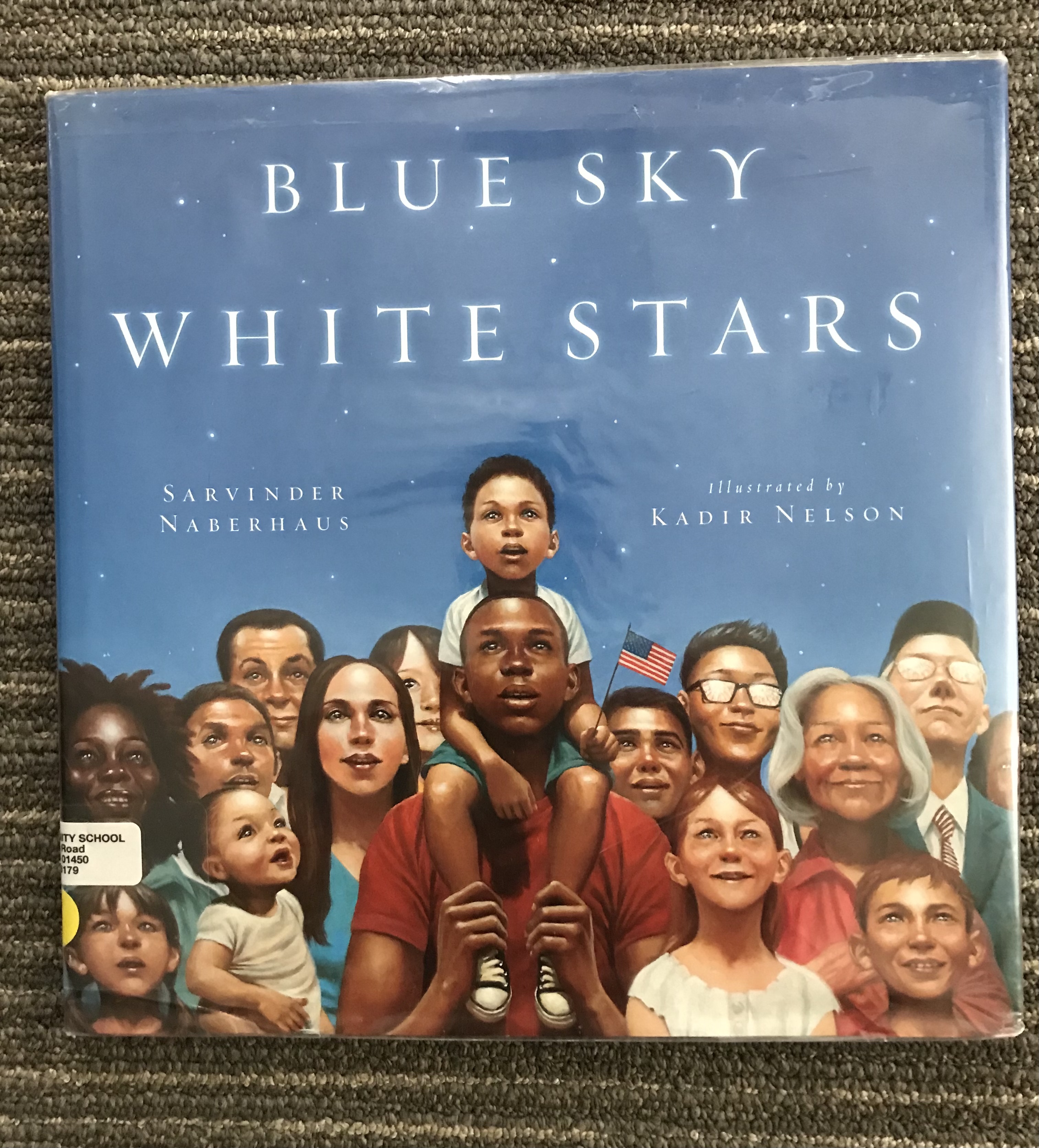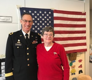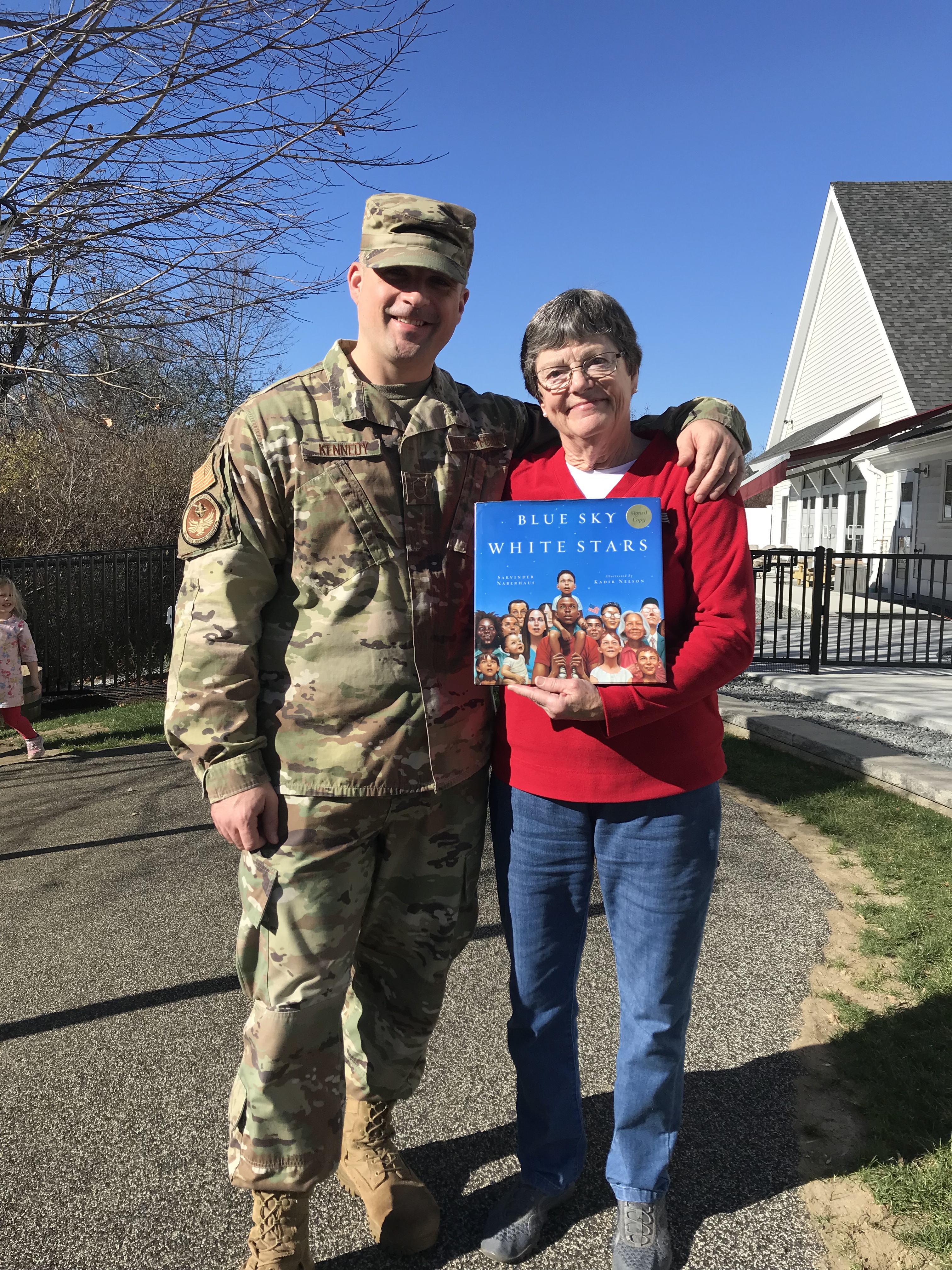 Air Force Sargent Mike came to school today. He had borrowed my book, Blue Sky, White Stars, to read to his daughter’s class at the elementary school. He returned it, and children had an opportunity to shake his hand and say ‘thank you’.