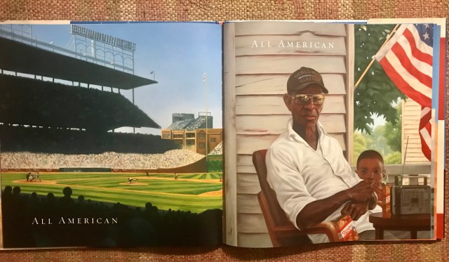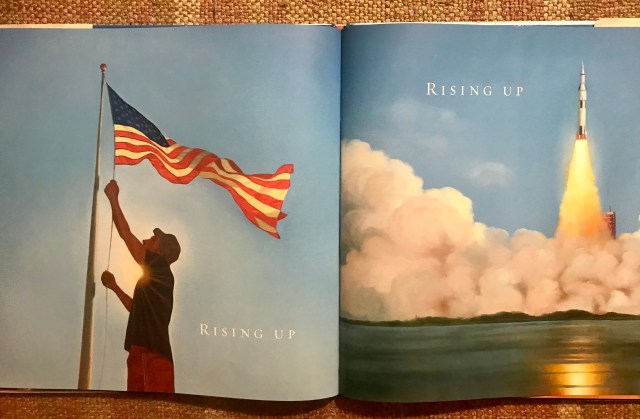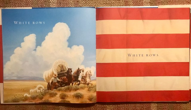 The book depicts America and the flag. On every open page, the words are the same; one is about the flag, and the other is about America.