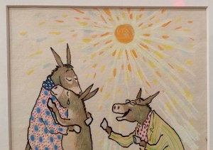 William Steig is one of my favorite author/illustrators. I have most of his books. I’ve been reading his books to children since I started teaching thirty-five years ago. Sylvester and the Magic Pebble, one of his best, turned 50 years old this year. It is as good today as it was 50 years ago. The Eric Carle Museum in Amherst, Massachusetts is celebrating this Golden Anniversary with an outstanding exhibit.