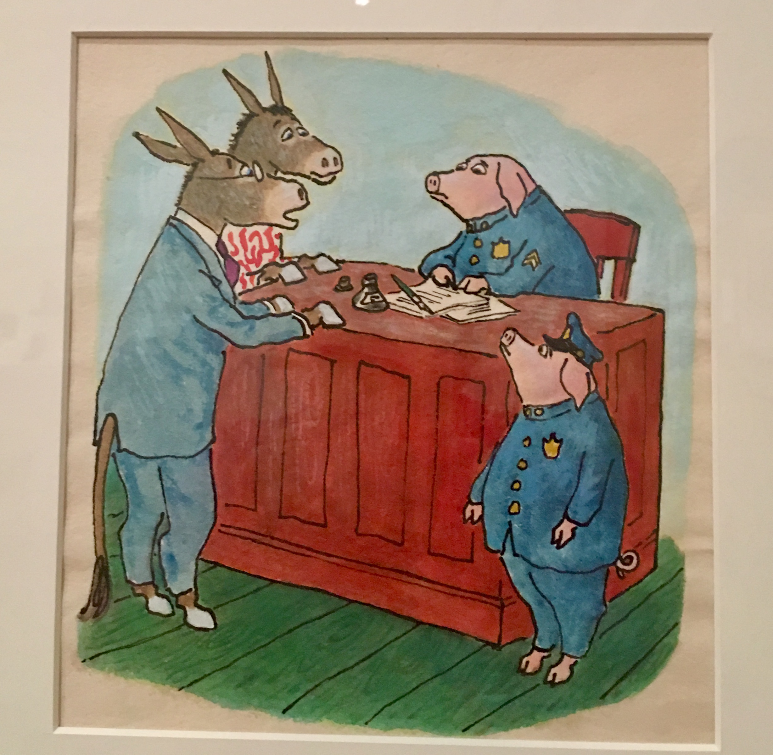 Fast forward to the museum. They have displayed the original art of Robert McCloskey and Make Way For Ducklings, and the original art of Ludwig Bemelmans’ Madeline. Up close, very close. Every pencil line and brush stroke were visible. I was inches away from the pictures I had only seen in picture books. For a book lover, this is as good as it gets.